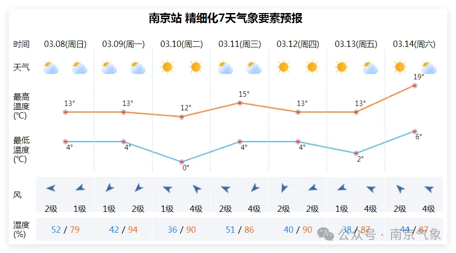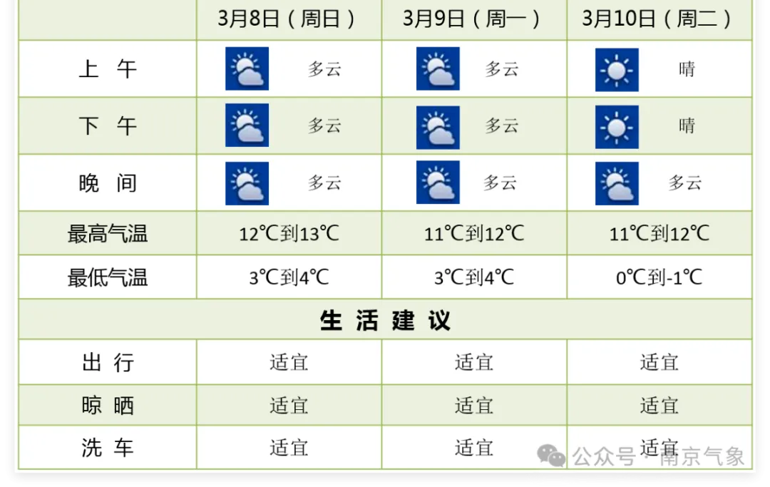 南京市气象台今天10时发布全市天气预报全市今天下午到夜里多云有时阴东到东北风4级左右今天最高气温:12℃到13℃明晨最低气温:3℃到4℃3月9日全市多云东到东北风4到5级3月9日最高气温:13℃到14℃3月10日最低气温:0℃到-1℃3月10日全市多云到晴东到东南风3到4级3月10日最高气温:13℃左右3月11日最低气温:3℃到4℃