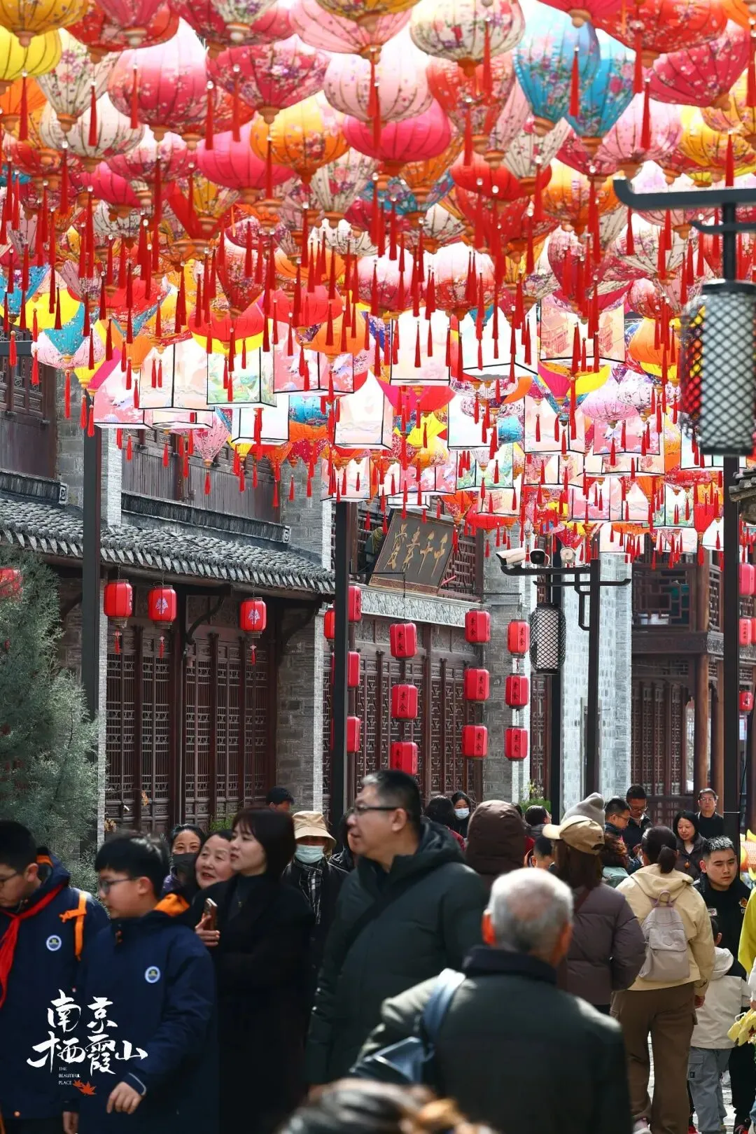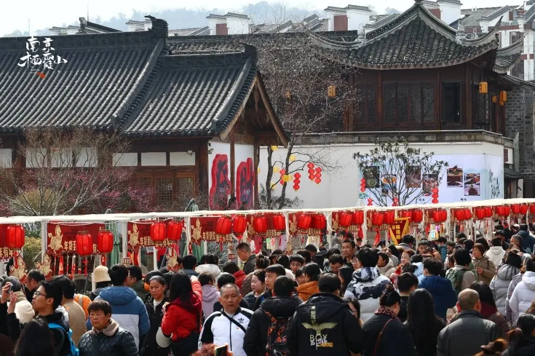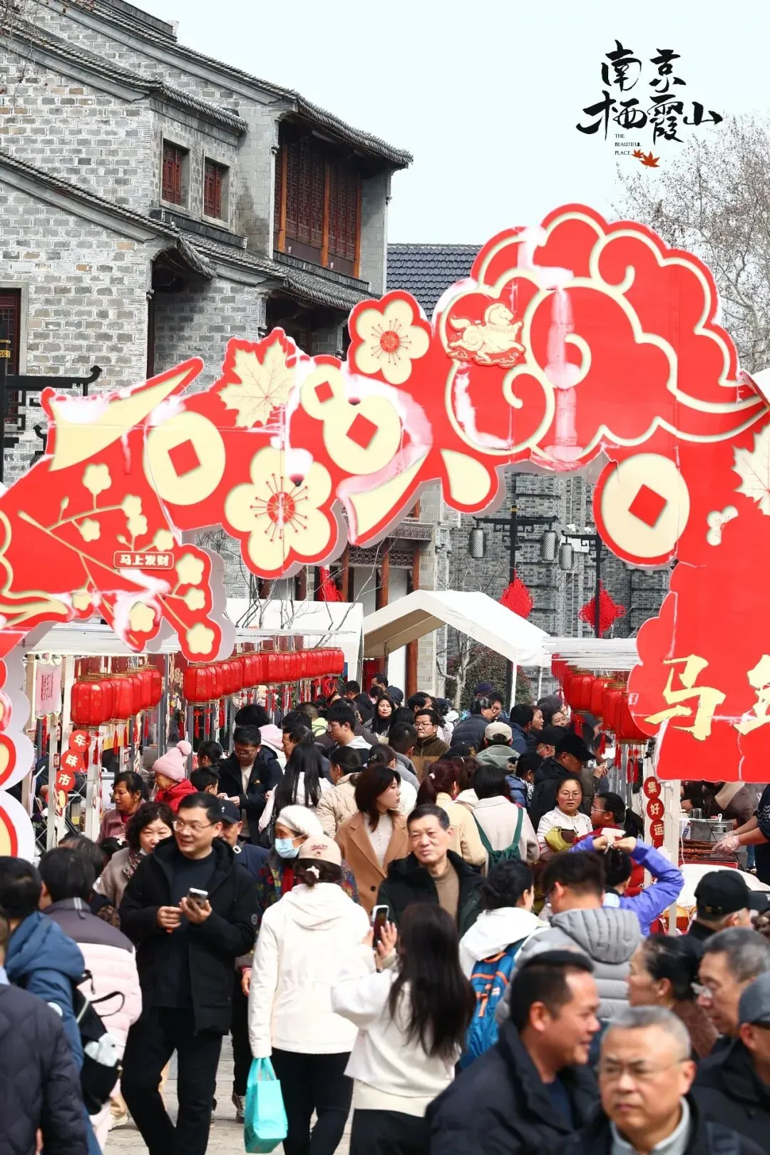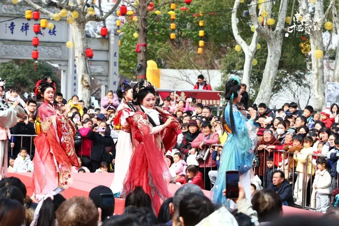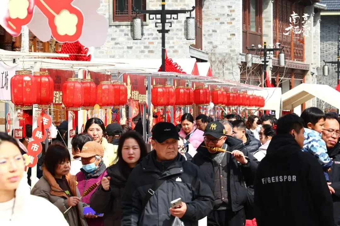 舞台之上歌舞翩跹,乐曲悠扬;台下游人比肩接踵,掌声阵阵。春风拂面,笑语盈山,一场场精彩演出点燃全场热情,栖霞山处处洋溢着欢腾与热闹。古街市集人头攒动,特色小吃、手作好物、民俗小铺一字排开,吆喝声、谈笑声、炊具碰撞声此起彼伏。游人摩肩接踵,边走边逛,烟火气与春日暖意交织,整条古街热闹非凡、年味般的喜气扑面而来。