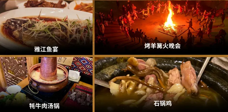 4、余香饶舌知藏味:雅江鱼宴、烤羊篝火晚会、牦牛肉汤锅、石锅鸡......总共7日的行程里,一共包含6早8正,保证让大家吃饱又吃好!