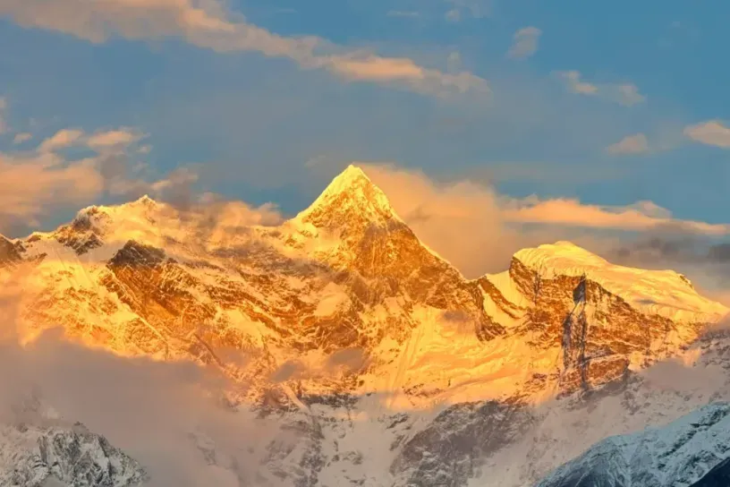 银装素裹的雪山瞬间熠熠生辉,震撼壮美