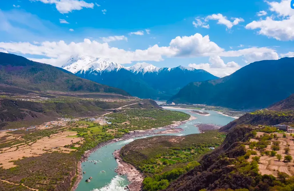 苯日山高耸入云,雪山高耸,河流蜿蜒