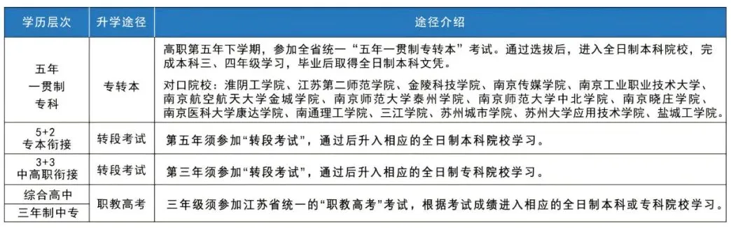 学校搭建了多通道升学途径,鼓励中高职学生升入高等院校继续学习深造。近10年,每年均有百余名同学通过“五年一贯制专转本”考试被全日制本科院校录取。
