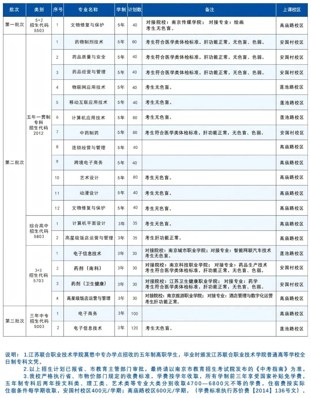 学校专业设置与时俱进,具有5+2专本衔接、五年一贯制专科、3+3中高职衔接、综合高中、:三年制中专五个办学类别。学校设有南京非遗学院、制药专业学院、数智应用产业学院和商贸旅游系四个院系,拥有药物制剂技术、计算机应用技术、商贸旅游文物修复与保护四大专业群,其中文物修复与保护、连锁经营与管理专业为江苏省特色专业;药物制剂技术、电子与信息技术专业为江苏省品牌专业;药品生产技术专业群、文物修复与保护专业群为省现代化专业群。非遗手工技艺实训基地、药物制剂技术实训基地为省现代化实训基地。