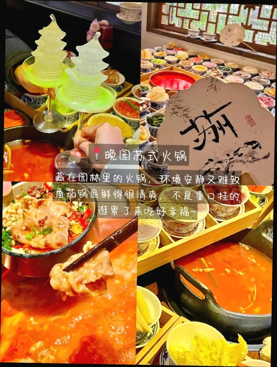 ③ 晚饭硬菜区(朋友局快乐翻倍) 晚园苏式火锅:番茄锅底清爽,涮肉很友好。 探花·意境江南菜:麻婆豆腐、鸡片都很下饭。 工春园(苏帮菜·苏式面宴):一碗面一份红烧,吃完直接进入“停止暂停内耗”状态。🤣