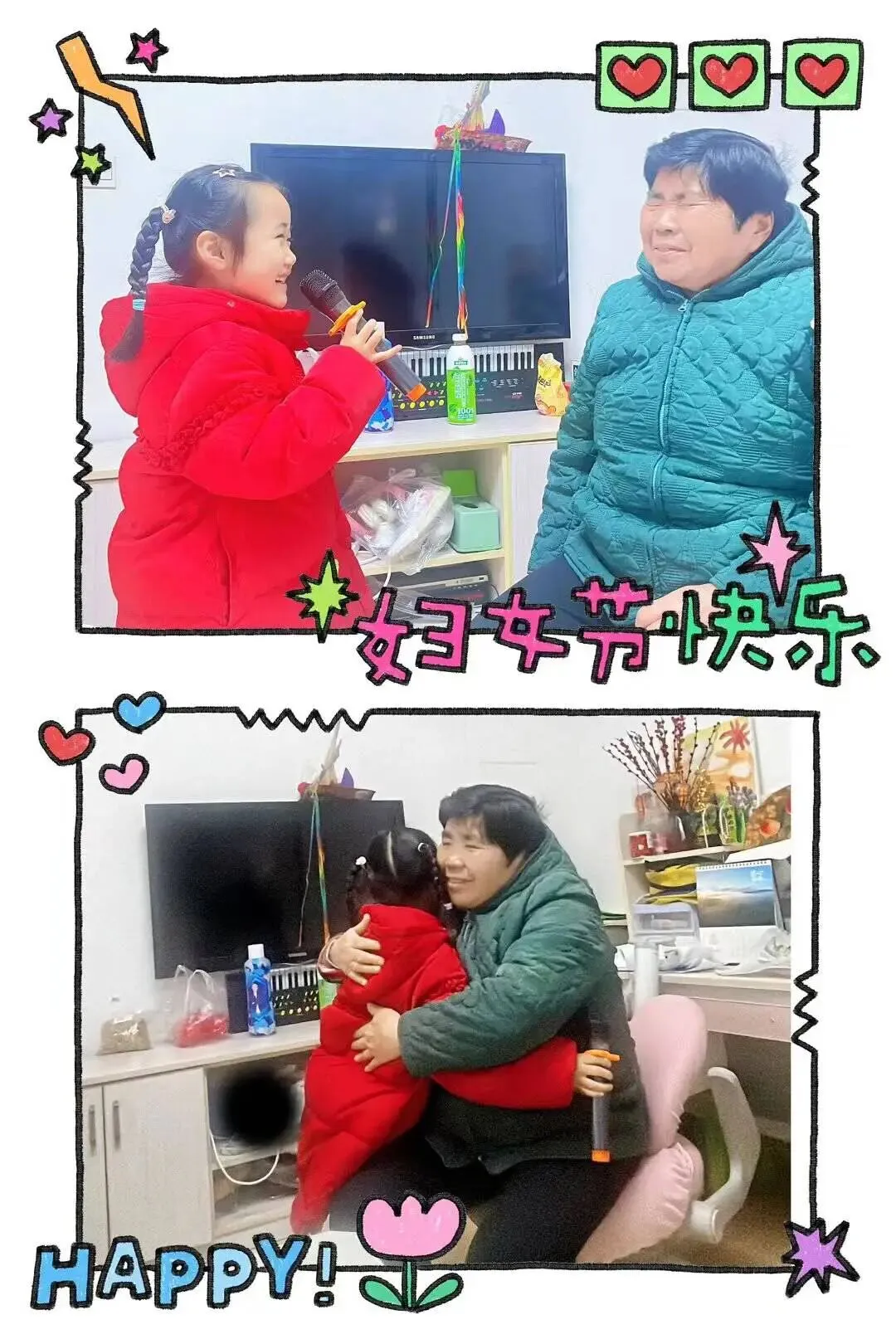 我给身边的“她”读故事,帮她捶背、揉肩,为她唱一首甜甜的歌,送上一个大大的拥抱,再端上一盆暖暖的洗脚水。在这个特别的节日里,这些小小的行动,都是我藏在心里的爱,要把甜甜的温暖,送给我最爱的她!