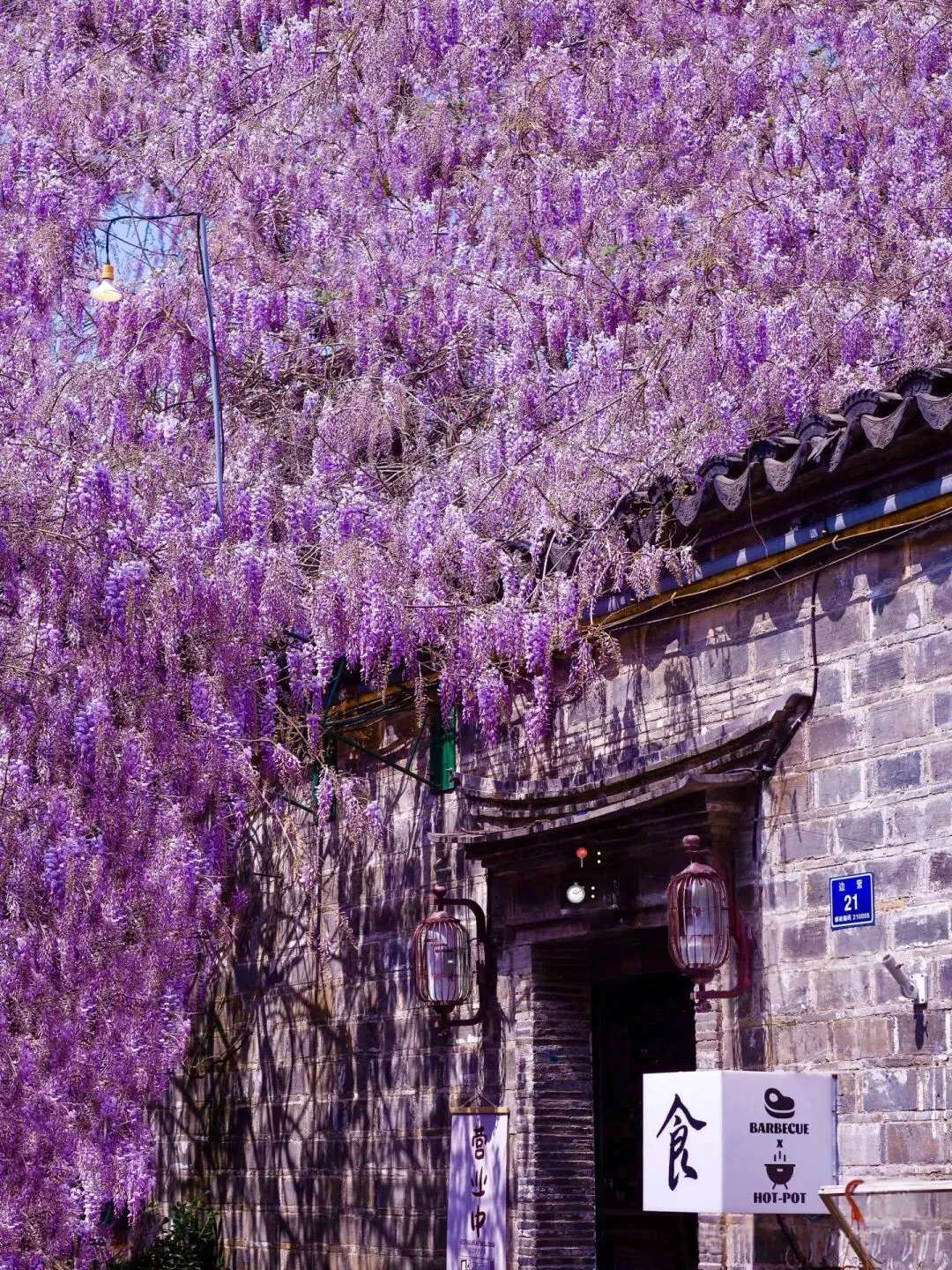 2. 紫藤花:老门东、玄武湖;紫色垂帘,傍晚暖光拍,文艺感翻倍