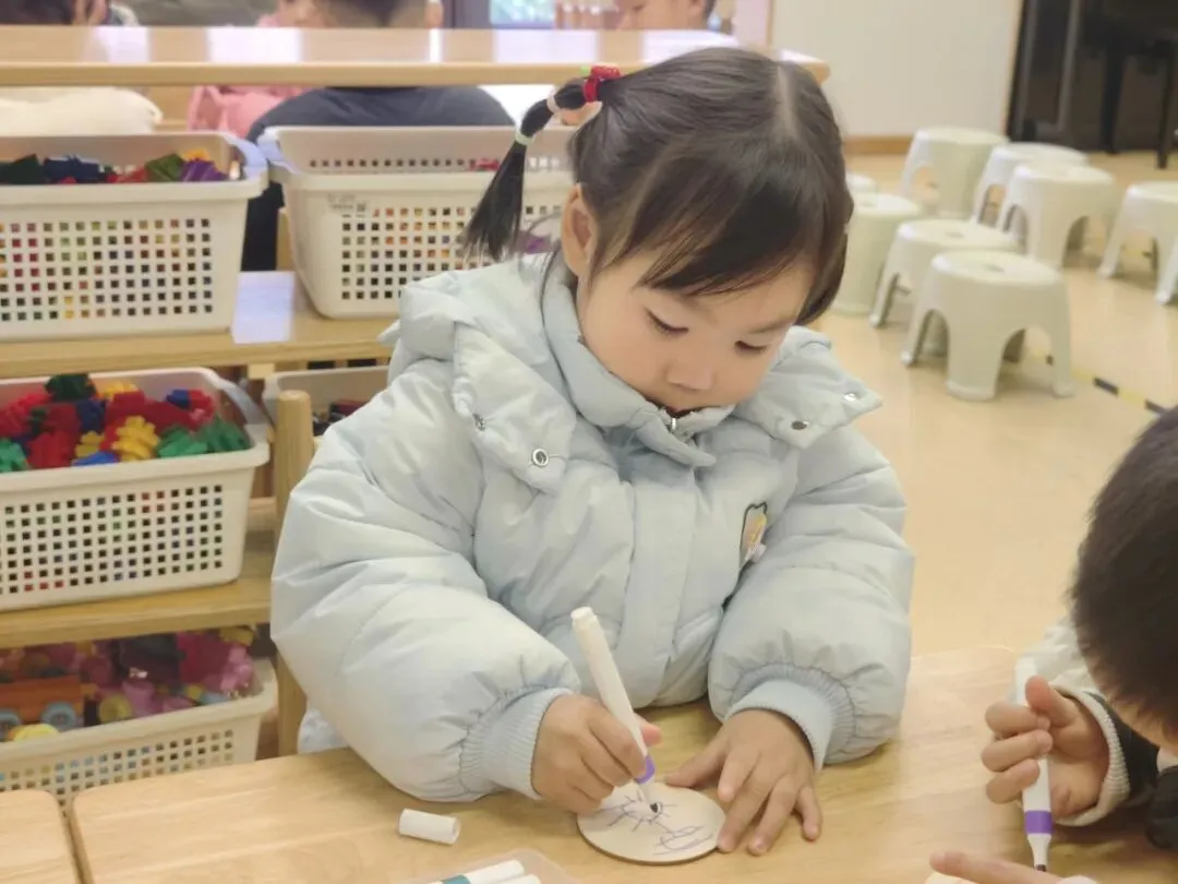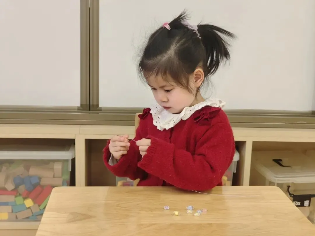 瞧,小一班的宝贝们他们拿起画笔,在木片上认真涂色装饰,制作出独一无二的杯垫,每一笔都藏着暖暖的心意。又化身小小设计师,挑选漂亮的彩珠穿线,做成可爱的串珠戒指。一份实用,一份甜美,都是孩子对女神最用心的告白。