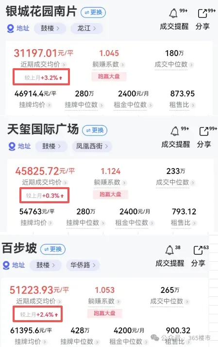 比如,“银小+金陵汇文”加持的天玺国际广场、银城花园南片,“拉小+29中”加持的百步坡,近期成交均价较上月均有涨价势头。