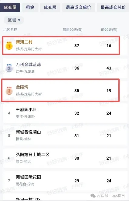 值得一提的是,根据某二手房平台展示的小区成交榜单,近90天成交量排名前十的小区中,多个学区房小区上榜。其中,新河二村和金陵湾更是冲上前三。