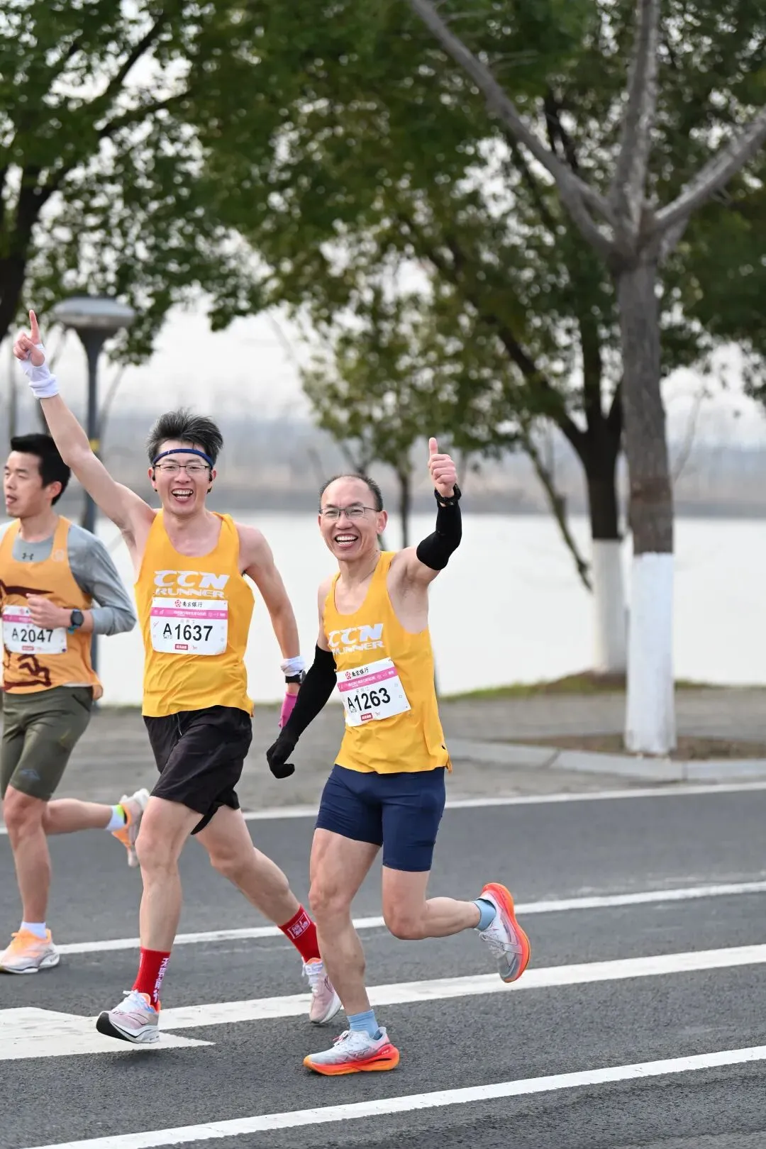 不记得是从几公里开始,我开始找摄影师。这是我不跑速度的最明显的表现,必须多整几张照片,留下我来过的痕迹。开始都是在人群中跑,后来就到边上了,否则很难有镜头的。一发不可收拾,一路看到摄影师就举手,还拉明江一起,心想难得一起,多搞点合照。反正是拍了不少张,干点这个事,很充实啊。不过虽然一直拍,但速度也没落下,300的兔子一直在前方,而且一直在前方,我的表显示平均411/412,但都一直没能追上他们。不过一路拍照,还是非常欢乐的。这里还要感谢我们公司摄影师同事,他还在赛道上给大家加油,借用一下鹿团的话“赛道上有一位摄影师冲我喊:中兴牛逼。我以为听错了。接着他又喊了句:CCN加油!”摄影师们辛苦了!