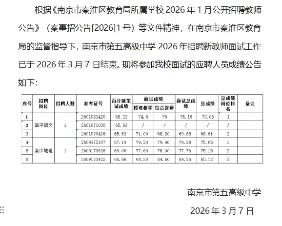 南京教师招聘||南京市第五高级中学2026年招聘新教师面试成绩公告