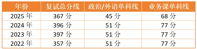 近几年复试分数线呈现出一定的波动:2025年复试总分要求为367分,单科线为政治/外语45分,专业课68分。而回顾前几年,2024年为396分,2023年为397分,2022年则为357分。这些分数线的变化,也反映了当年考题难度和生源情况的不同。