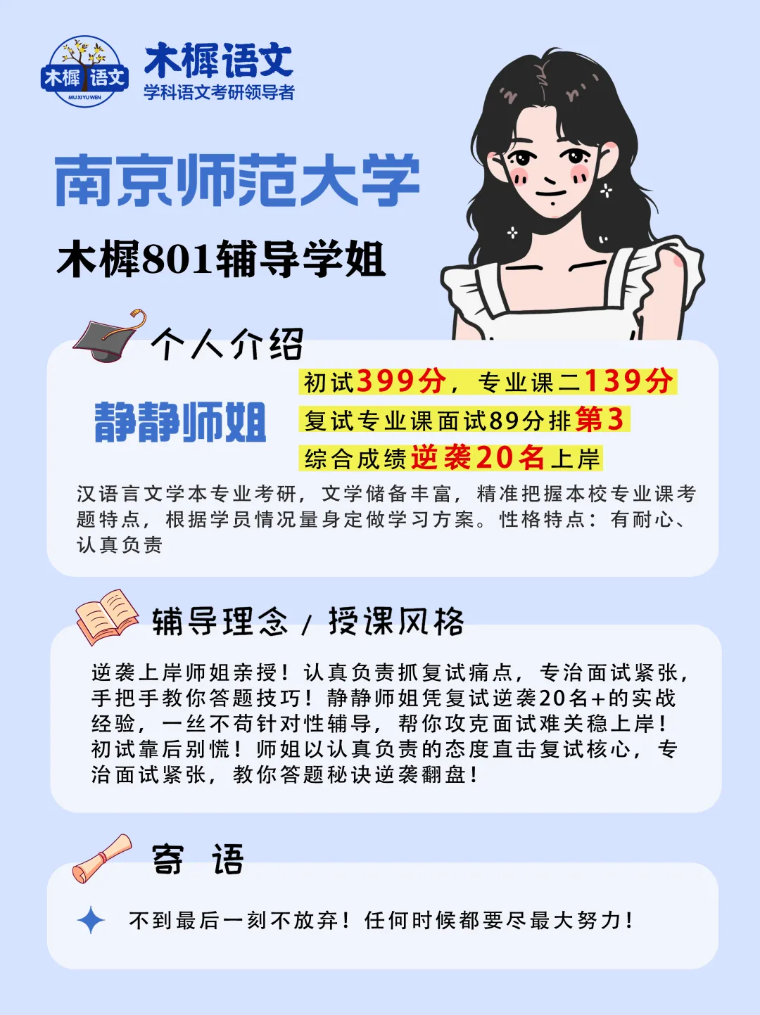 亲爱的各位南师大学科语文追梦人,恭喜你已经顺利考完南师大学科语文的初试!这将近一年时间的披星戴月真的超辛苦,坚持到最后就是最大的胜利,必须给你点个大大的赞!