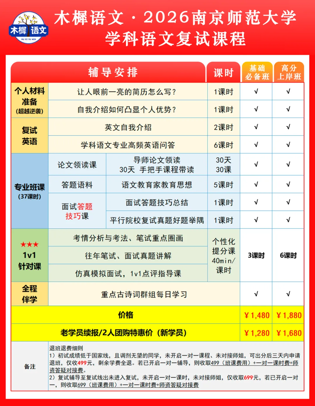 26南师大学科语文复试的宝子看过来!木樨语文的复试课程新鲜出炉咯~咱们分了基础必备班(1480元)和高分上岸班(1880元),基础班包含个人材料准备、复试英语、37课时专业班课这些核心内容,足够搞定复试基础;高分班额外加了更多1v1针对课,不管是真题讲解还是仿真模拟面试,都能给到更细致的指导。现在老学员或者2人团报还有优惠,基础班1280元、高分班1680元就能报,还附了退费规则,不用担心白花钱~想稳稳上岸南师的,这个复试课可以冲!