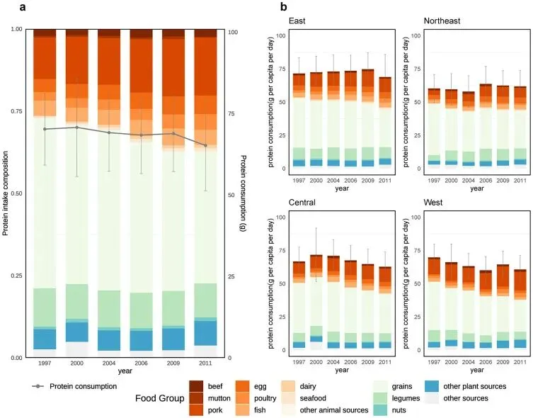 ▲Figure 2. 1997-2011年间各项环境足迹的演变趋势及食物组贡献研究的一个核心思维亮点在于对区域异质性的拆解。作者并未仅给出全国平均值,而是对比了东部、中部、西部和东北部。分析发现,即使总摄入量相似,环境足迹也会因蛋白质来源不同而迥异。例如,西部地区由于对牛肉和猪肉的依赖度更高,其人均环境足迹反而超过了总蛋白摄入量更高的东部地区。