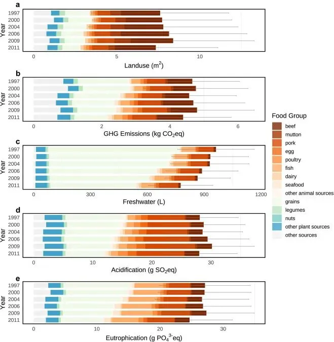 在环境足迹核算部分,研究采用了生命周期评价(LCA)方法。作者收集了涵盖温室气体排放、土地利用、淡水消耗、酸化和富营养化五项指标的系数。核算边界设定为“从摇篮到零售”(cradle-to-retail),这包括了上游生产、加工、包装和运输环节,但剔除了消费者端的烹饪和浪费环节,这种边界设定在现有膳食环境研究中具有较高的稳健性和可比性。