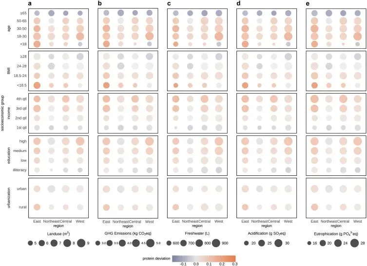 - • 结论 2: 社会经济因素驱动了营养与环境的双重差异。高收入、高教育水平和男性群体普遍存在蛋白质摄入过剩及高环境足迹;而老年人、低收入群体和肥胖人群则面临蛋白质缺乏风险。