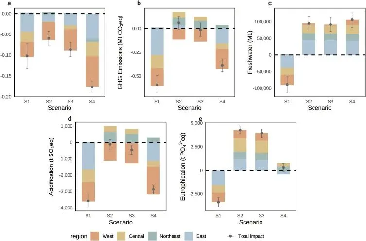 ▲Figure 3. 2011年不同亚组群体的蛋白质摄入偏差与环境影响矩阵最后,文章构建了四个前瞻性情景进行政策模拟。S1(仅满足推荐量而不改变结构)展示了减少浪费的潜力;S2(完全遵循平衡膳食指南)揭示了健康饮食可能带来的额外环境成本;而S3(禽肉替代红肉)和S4(植物蛋白替代动物蛋白)则提供了解决方案。作者利用蒙特卡洛模拟进行了100次迭代,以量化环境足迹系数中的不确定性,这增加了结论的科学性。