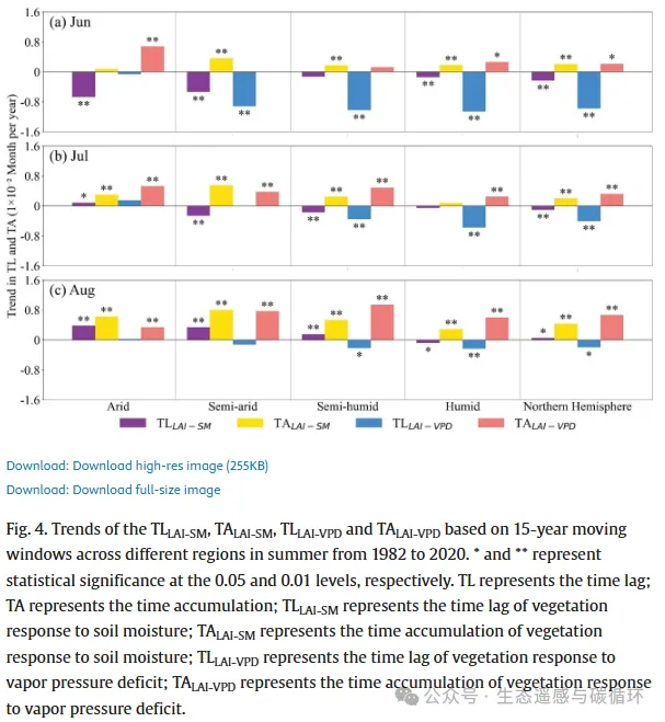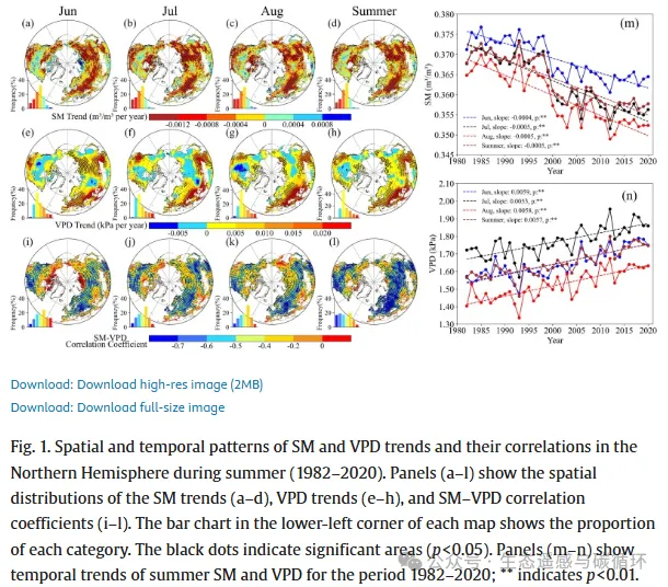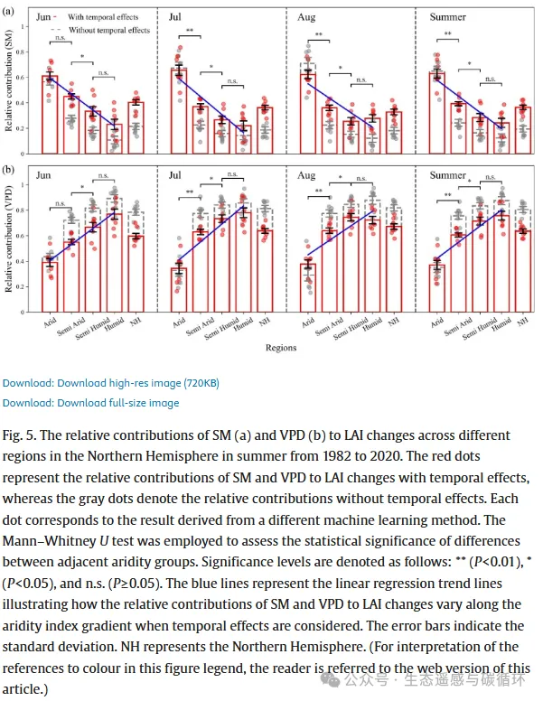 在全球气候变暖背景下,陆地生态系统面临日益增强的水分胁迫,其中土壤水分减少所导致的陆地干旱以及饱和水汽压差升高所引发的大气干旱成为影响植被生长的重要水分限制因素。随着气温持续升高,大气蒸发需求不断增强,饱和水汽压差呈显著增加趋势,同时降水时空分布的不均衡以及蒸散过程的强化使得土壤水分持续下降,进一步加剧陆地表层干燥程度。这两种干旱过程往往在陆气相互作用机制下同时发生,并通过复杂的反馈机制共同影响生态系统水分循环与能量交换,从而对植被生长、碳吸收能力以及生态系统稳定性产生深远影响。已有研究表明,干旱胁迫不仅能够抑制植物光合作用和气孔导度,还可能导致植被生长减缓甚至大规模死亡,对全球碳循环和生态系统功能产生重要影响。然而,在不同气候背景和干旱度条件下,植被对土壤水分和大气干旱的响应机制仍存在显著差异。一方面,在水分受限地区,植被生长通常对土壤水分变化更加敏感;另一方面,在水分相对充足地区,大气蒸发需求的增强可能成为限制植被生长的重要因素。此外,植被对干旱胁迫的响应不仅具有即时效应,还可能表现出明显的时间滞后和累积效应,这进一步增加了理解陆地生态系统水分调控机制的复杂性。因此,在全球气候变化持续加剧的背景下,深入理解陆地干旱与大气干旱对植被结构变化的相对影响及其在不同干旱度梯度下的变化规律,对于准确评估生态系统对气候变化的响应、改进陆地碳循环模拟以及制定生态系统适应气候变化的管理策略具有重要意义。本研究从陆地—大气耦合水分过程的角度出发,系统探讨了土壤水分与蒸汽压亏缺在不同干旱度梯度下对植被结构变化的相对作用,并在分析过程中综合考虑了干旱影响的时间滞后和累积效应,从而更加全面地揭示了植被对多尺度水分胁迫的响应特征。研究通过构建多时间尺度的干旱特征变量,并利用多种机器学习算法对植被结构变化进行归因分析,有效整合了多源数据和多模型信息,使不同干旱因子的影响能够在统一框架下进行量化比较。研究结果揭示了土壤水分与蒸汽压亏缺在不同气候干旱度条件下对植被变化具有明显不同的主导作用,并表现出沿干旱度梯度变化的动态平衡关系,从而从机制层面深化了对陆地—大气干旱耦合影响植被结构变化的理解。同时,研究进一步指出时间滞后和累积效应能够显著改变干旱因子对植被变化的贡献程度,使得土壤水分的影响在考虑时间效应后得到强化,而大气干旱的作用相对减弱。这一分析框架将干旱过程的时序特征与机器学习归因方法相结合,为揭示复杂气候因子对生态系统结构变化的综合影响提供了新的思路,也为未来在全球变化背景下评估生态系统水分胁迫风险和预测植被变化趋势提供了重要参考。陆地干旱和大气干旱均会导致植被结构发生变化,但两者对植被变化的相对贡献仍缺乏清晰认识。本文利用八种机器学习算法,系统评估了1982—2020年北半球土壤水分和饱和水汽压差对叶面积指数变化的相对贡献。研究结果表明,随着干旱度指数的增加,土壤水分对叶面积指数的相对贡献逐渐降低,而饱和水汽压差的贡献则逐渐增加。在干旱地区,土壤水分对植被结构变化的影响显著强于饱和水汽压差,而在湿润地区则表现出相反的特征。此外,在考虑时间滞后和时间累积效应后,土壤水分对叶面积指数变化的相对贡献进一步增强,而饱和水汽压差的贡献则在大多数区域显著减弱。研究表明,在当前土壤水分持续下降和饱和水汽压差不断增加的气候背景下,陆地干旱与大气干旱对植被结构变化呈现出明显的“跷跷板效应”。该发现有助于更加准确地理解和预测未来气候变化条件下植被生态系统的响应。