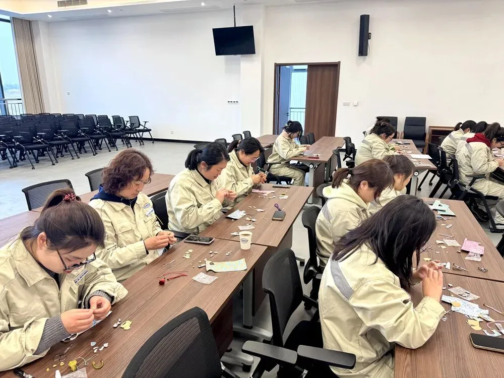 活动现场暖意融融,桌面上整齐摆放着色彩艳丽的宋锦面料、莹润光洁的配珠、精致小巧的制作工具。在老师的指导下,女职工们纷纷化身“非遗手艺人”,从宋锦面料的挑选、纹样的搭配,到剪裁塑形、再到挂坠配件的组装,每一个步骤都认真细致、专注投入。