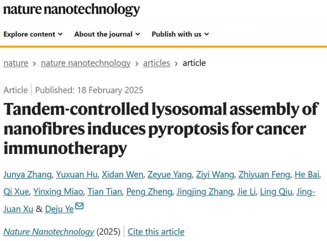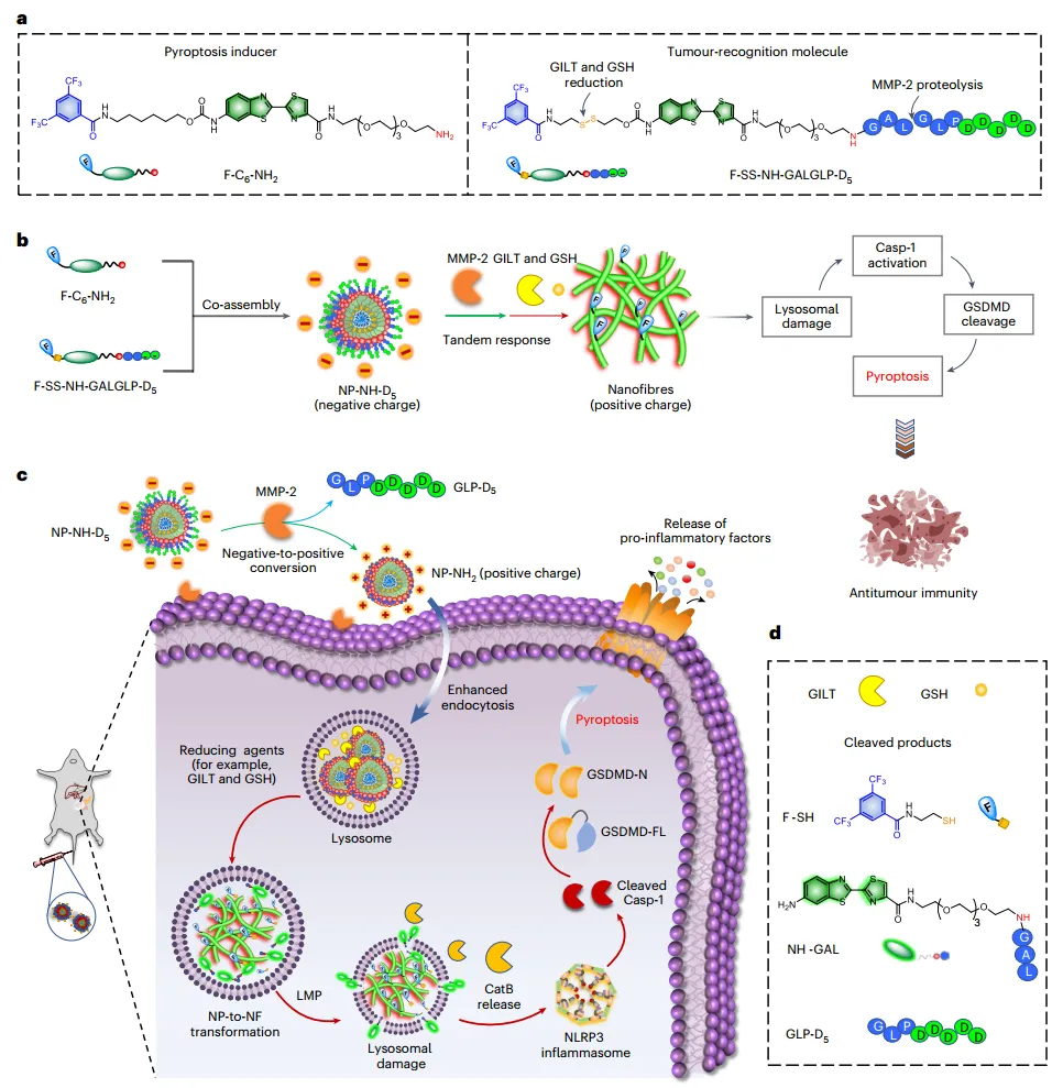 2025年2月18日,南京大学叶德举团队在Nature Nanotechnology(IF=38.1)在线发表题为“Tandem-controlled lysosomal assembly of nanofibres induces pyroptosis for cancer immunotherapy”的研究论文,该研究表明纳米纤维的串联控制溶酶体组装诱导用于癌症免疫治疗的焦亡。在这里,研究人员报道了一种肿瘤特异性纳米粒子(NP-NH-D5 ),它通过破坏溶酶体来激活焦亡,用于癌症免疫治疗。通过对细胞外基质金属肽酶-2和细胞内还原剂的串联反应,NP-NH-D5在肿瘤细胞溶酶体中经历了负电荷到正电荷的逆转和纳米颗粒到纳米纤维的转化。如此形成的非肽纳米纤维有效地破坏溶酶体,并触发gasdermin-D介导的焦亡,导致强烈的免疫原性细胞死亡和免疫抑制肿瘤微环境的缓解。在体内,NP-NH-D5抑制原位4T1乳腺肿瘤,防止转移和复发,并延长生存期,而没有全身副作用。此外,它大大增强了PD-L1抗体免疫疗法在4T1晚期肺转移和侵袭性原位Pan02胰腺肿瘤模型中的有效性。该研究可能为开发精确癌症免疫疗法的刺激反应性焦亡诱导剂奠定基础。