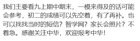 对此,中华中学的老师在评论区回复:学校主要看九上期中/期末成绩,一模如果来得及也会参考,初二的成绩可以先空着,有了再补……