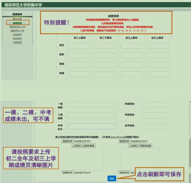 除了现在的信息登记,中考特长生报名登记将在5月份进行(参考往年时间),其中也需要填报学生的成绩,包括初二上下学期期末,初三上期中、期末,一模、二模等成绩。(注意:需要上传成绩证明,一模成绩分数条或截屏、短信等。如果没有一模分数,九年级上学期期中、期末考试分数也可以作为佐证。)
