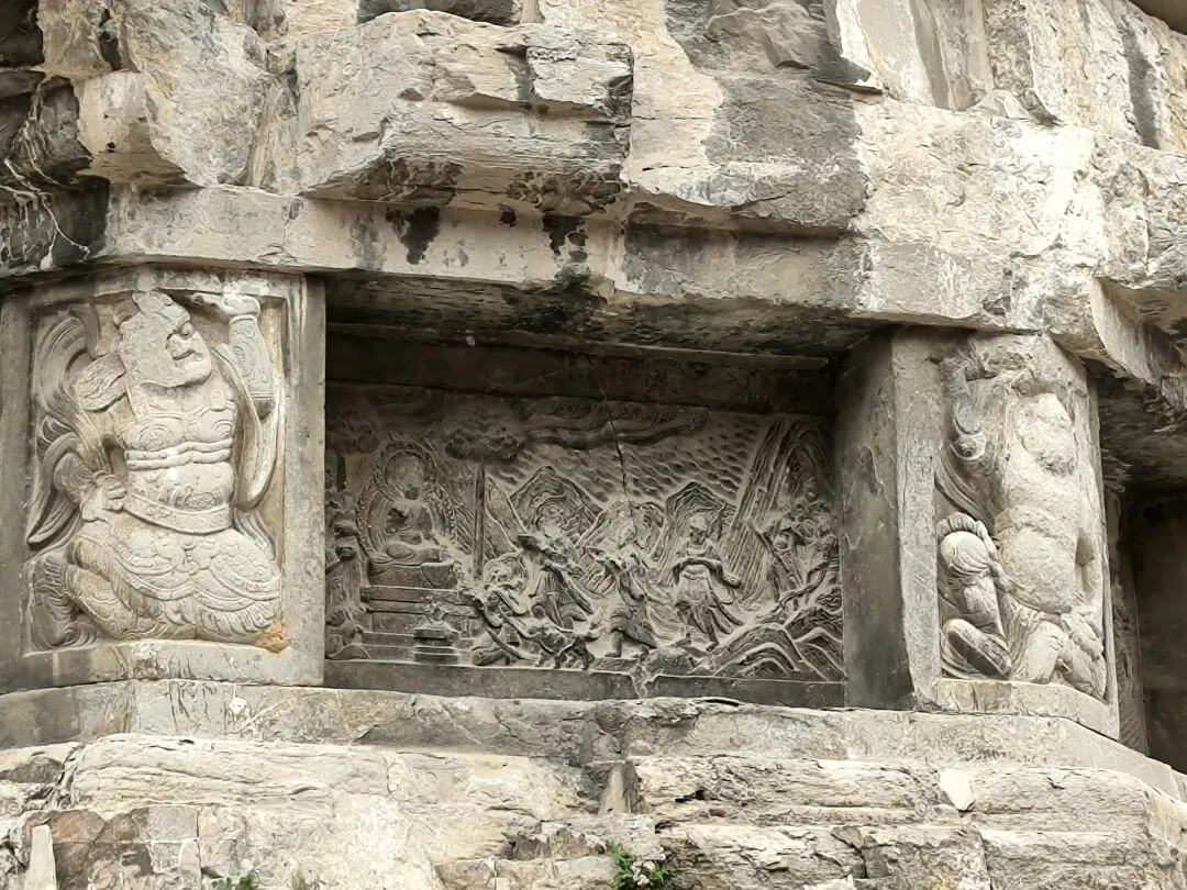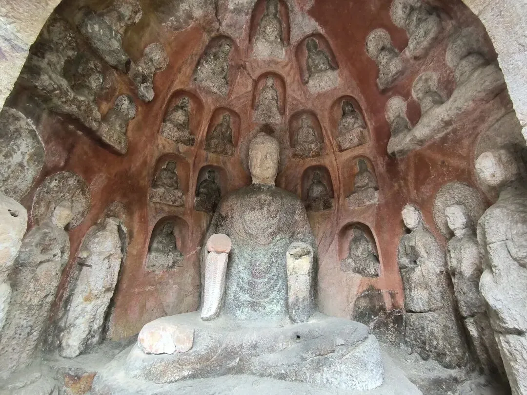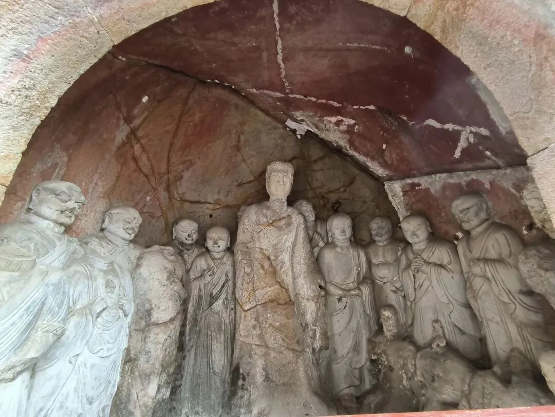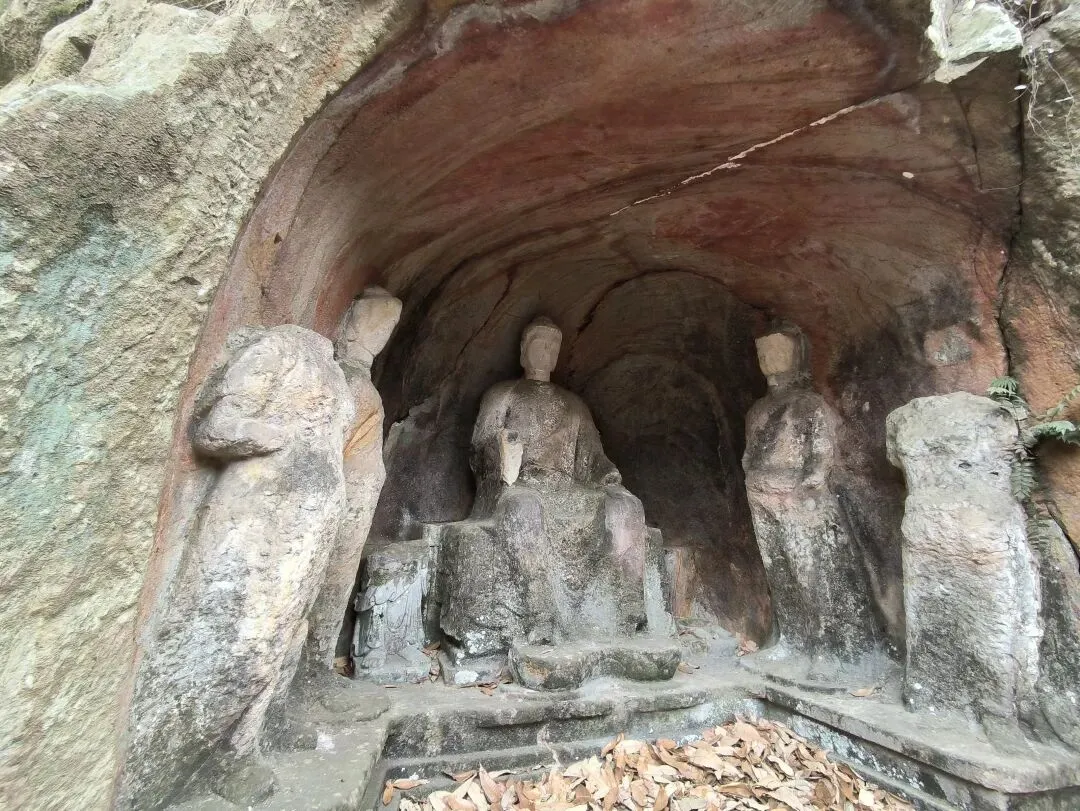 嗣后,法度大师又重新修建,并与其子一起在西峰石壁开凿洞窟,历四年之久,雕造了无量寿佛与观世音、大势至二菩萨像。