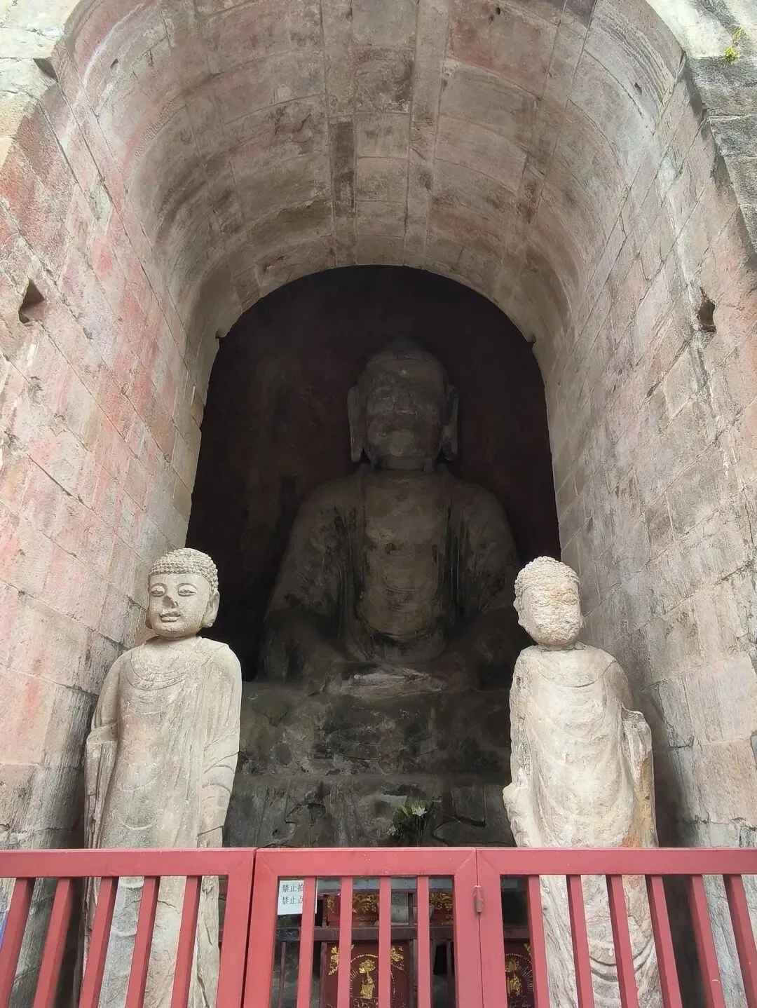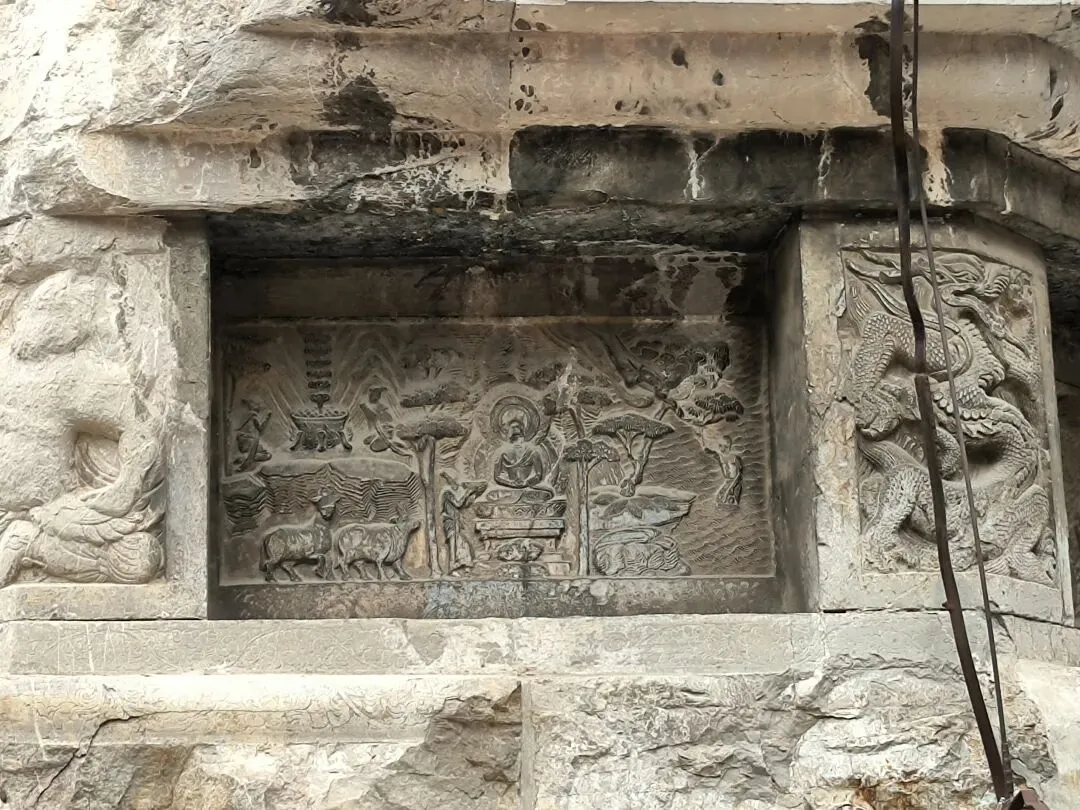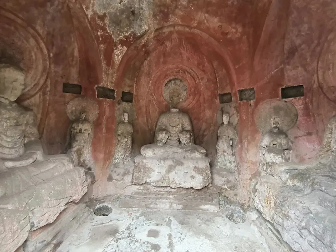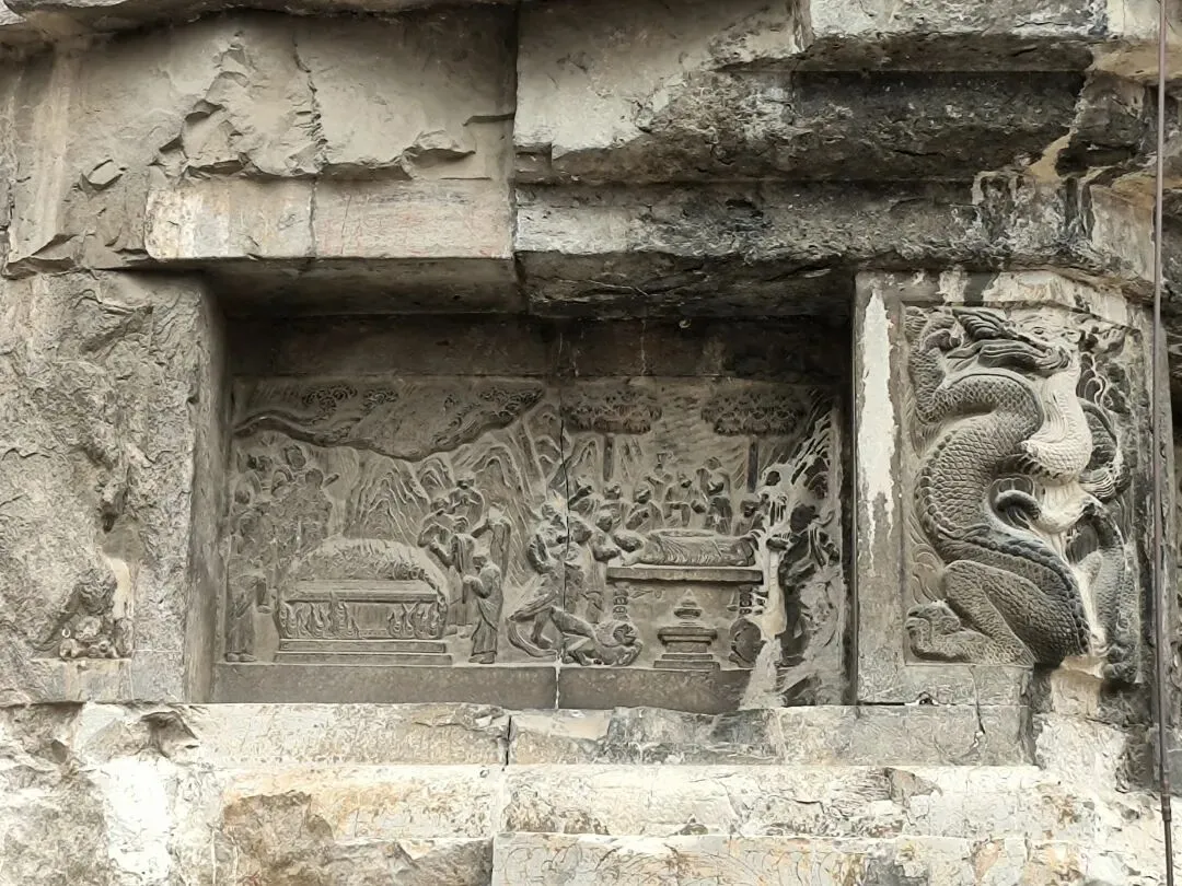嗣后,法度大师又重新修建,并与其子一起在西峰石壁开凿洞窟,历四年之久,雕造了无量寿佛与观世音、大势至二菩萨像。