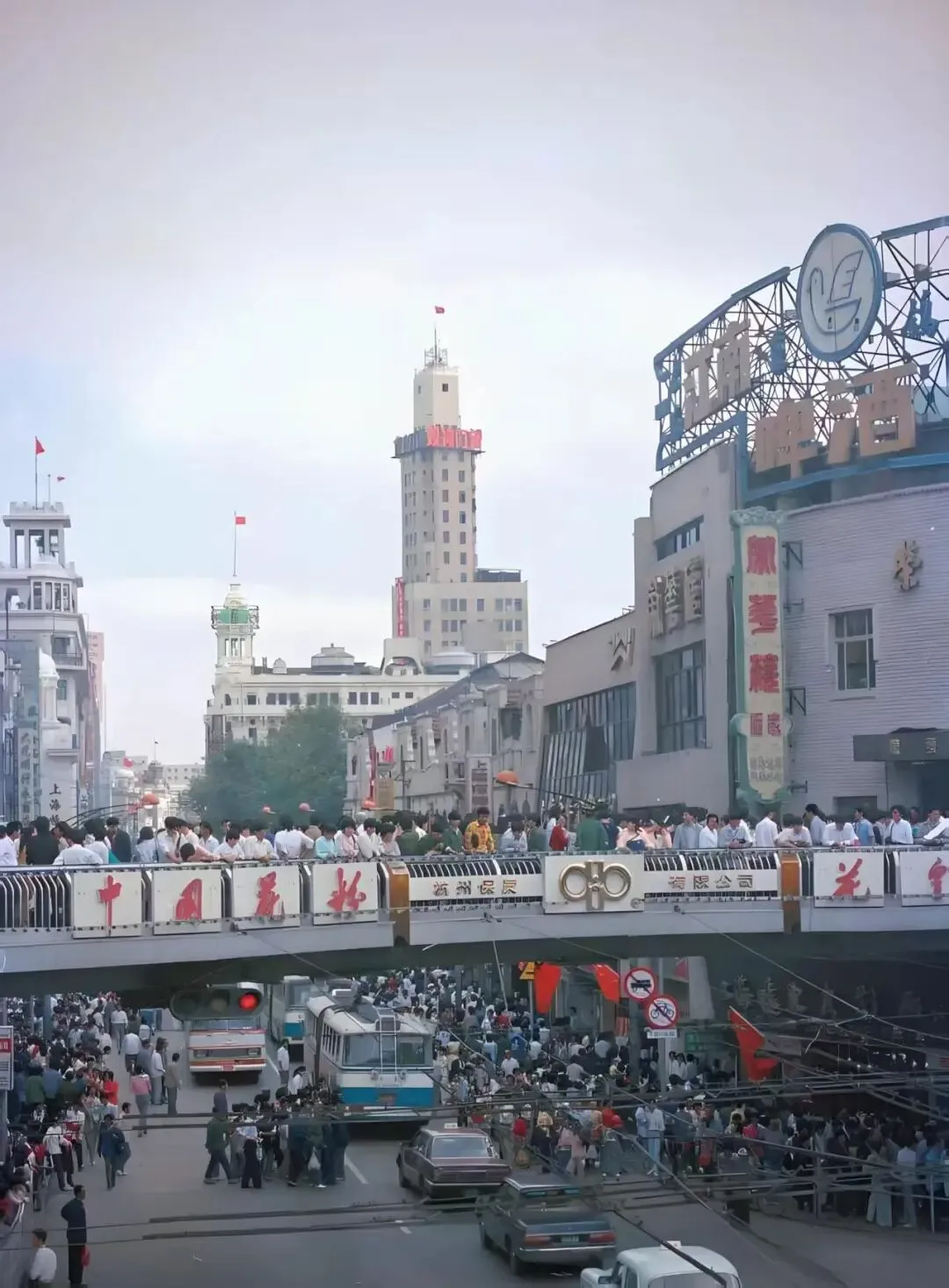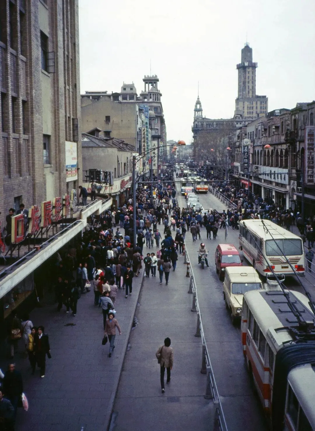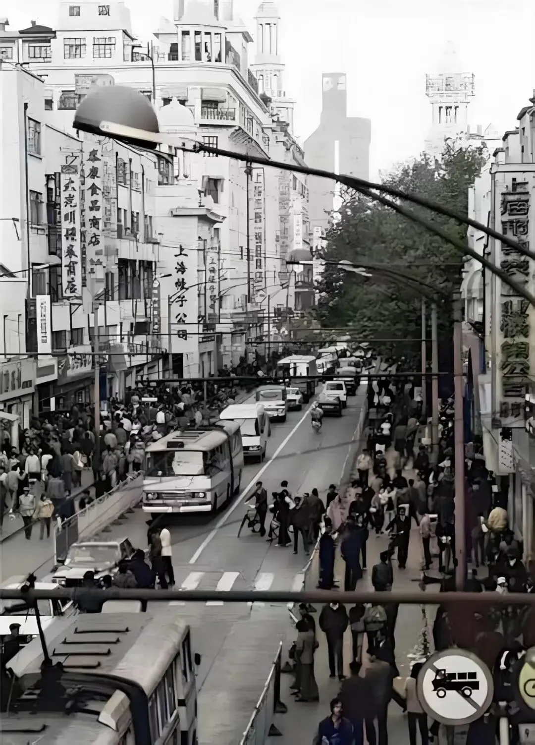 南京路上人流拥挤,是从早到晚的,只要商店开门,不打烊,就一直是熙熙攘攘,摩肩擦踵的。因人太多,南京路人行道不够宽,许多人都走在马路上,有时能有一半的马路被行人所占,电车来时,女售货员拿着售票盒,不断拍打着车厢,大喊着提醒游客注意安全。记得20路电车南京路上福建中路站,对应的店面好像是老庙黄金店,还有亨达利钟表行等,那里候车人多,电车进站有时也连续两辆,车避人,人追车,总是拥挤,秩序混乱。还有游客在南京路上,横穿马路时,仗着人多,经常一拥而过,很容易发生交通事故。可是,在当时,我们不仅没有亲眼所见有交通事故发生,也几乎没有从报纸或电视台上看到类似新闻。在南京路上因人多车多引发的事故或许有,但概率恐怕不高。