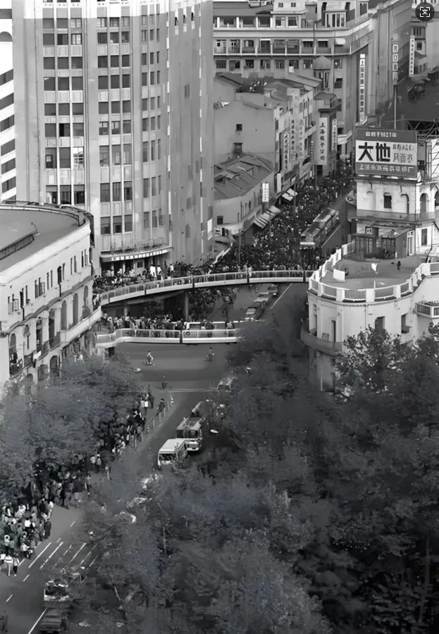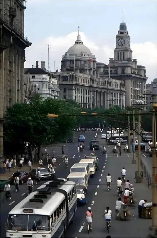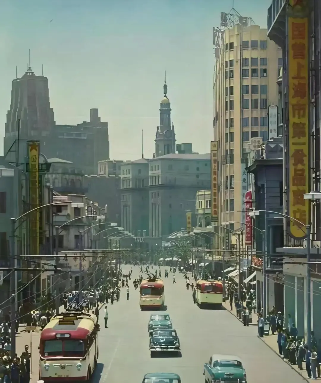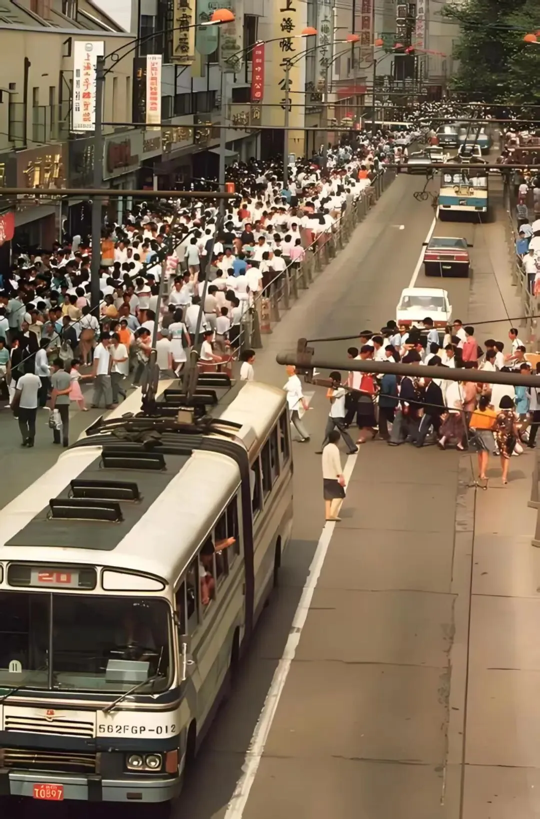 南京路上人流拥挤,是从早到晚的,只要商店开门,不打烊,就一直是熙熙攘攘,摩肩擦踵的。因人太多,南京路人行道不够宽,许多人都走在马路上,有时能有一半的马路被行人所占,电车来时,女售货员拿着售票盒,不断拍打着车厢,大喊着提醒游客注意安全。记得20路电车南京路上福建中路站,对应的店面好像是老庙黄金店,还有亨达利钟表行等,那里候车人多,电车进站有时也连续两辆,车避人,人追车,总是拥挤,秩序混乱。还有游客在南京路上,横穿马路时,仗着人多,经常一拥而过,很容易发生交通事故。可是,在当时,我们不仅没有亲眼所见有交通事故发生,也几乎没有从报纸或电视台上看到类似新闻。在南京路上因人多车多引发的事故或许有,但概率恐怕不高。
