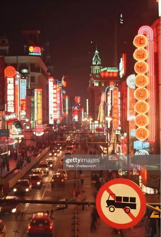 南京路原先不是步行街,改为步行街是1995年的事。不是步行街时,南京路上是通公交车的,有20路、27路电车,其中20路电车是唯一贯穿南京路的。许多人逛街走累了,就乘坐电路。我们经常从南京东路逛到南京西路,见过了那一排长长的宣传玻璃橱窗后,商店渐少,人也乏了,便从南京西路乘电车返回外滩。暮色渐合,华灯初上,我们坐在车上见到是街边各有特色的商店橱窗,各类各色的广告牌,霓虹闪烁,灯光璀璨,好一派金光耀目的十里洋场。