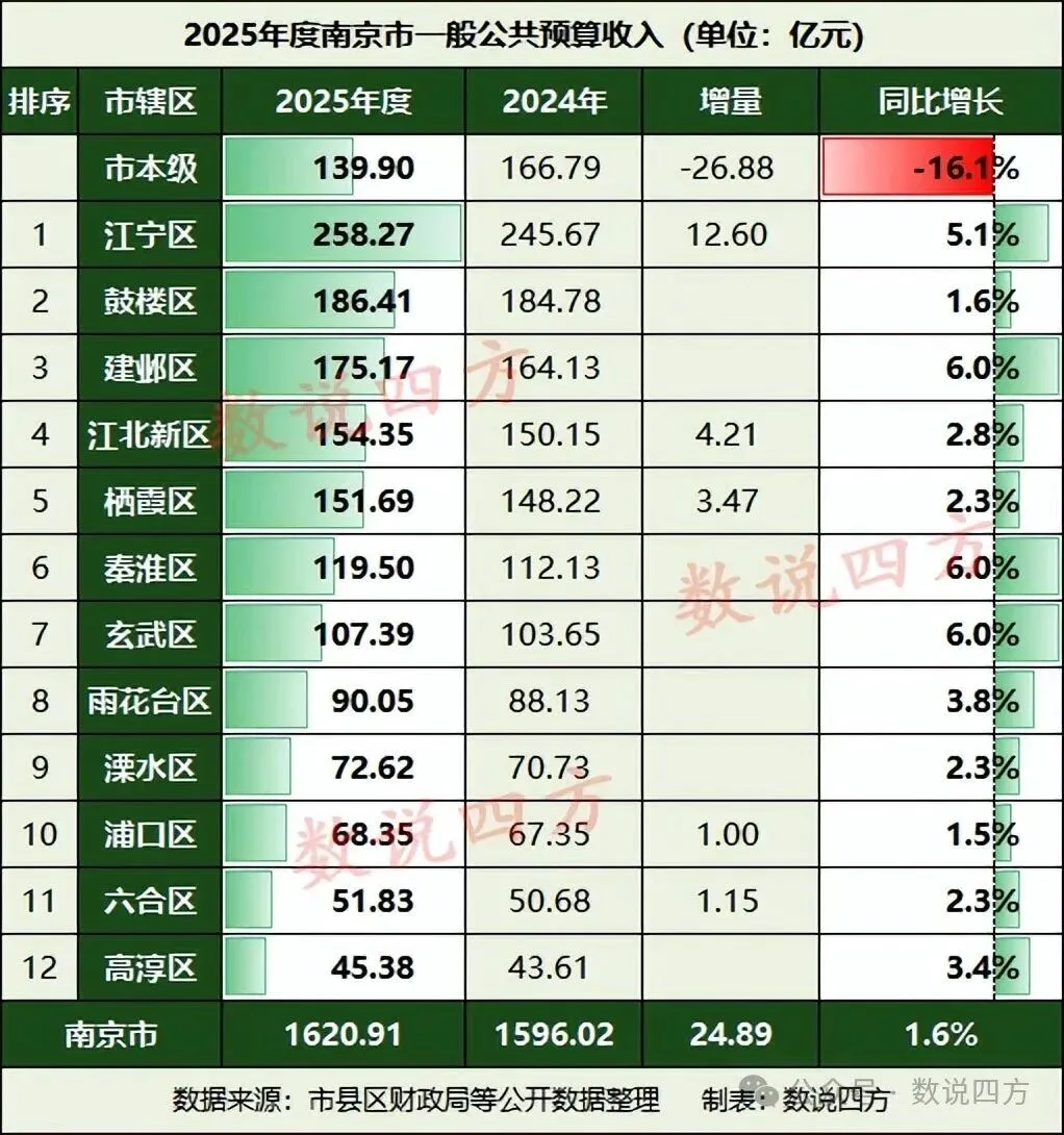 市本级2025年财政收入139.9亿元,与2024年相比减少了26.88亿元,同比下降16.1%,降幅高达两位数,在南京市财政收入中的比重明显下降。