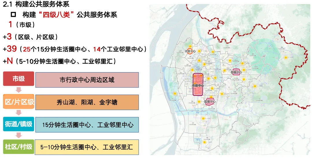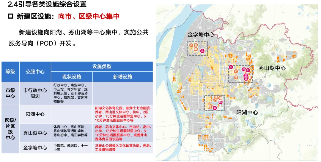 在新建区,推行“集中聚合+POD驱动”模式,结合人口规模及空间分布,推动公共服务设施集中布局、功能复合增效,引导市、区级重大公共服务设施向阳湖、秀山湖等城市核心区及生活圈、产业片区中心集聚,采用公共服务导向(POD)开发模式,整合医养、教育、文体等互补性功能,打造一站式设施综合体;同时,将生活圈级设施与公园绿地、公交场站、停车场等关联性设施统筹规划,构建“服务+生活+交通”一体化空间,打造高品质宜居新区。