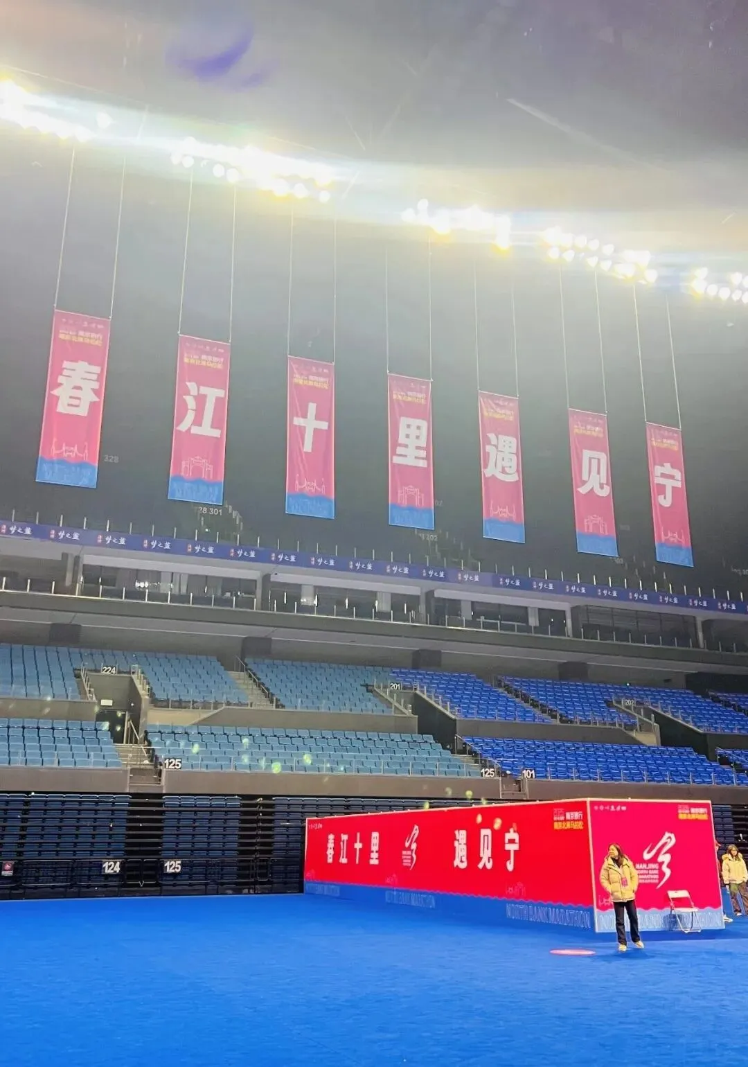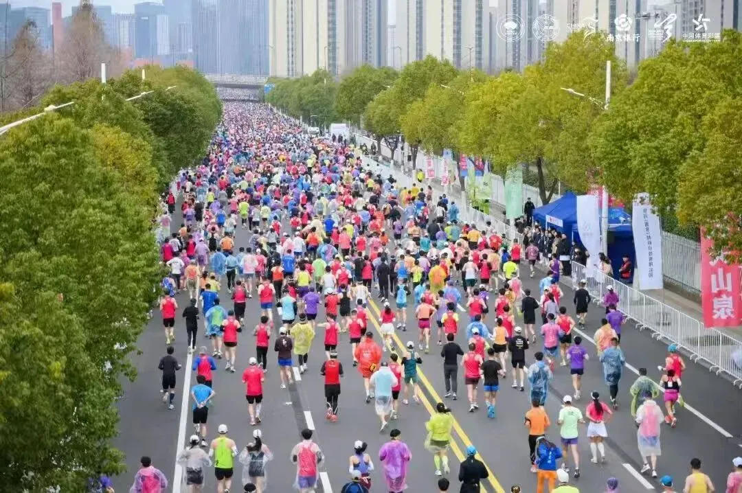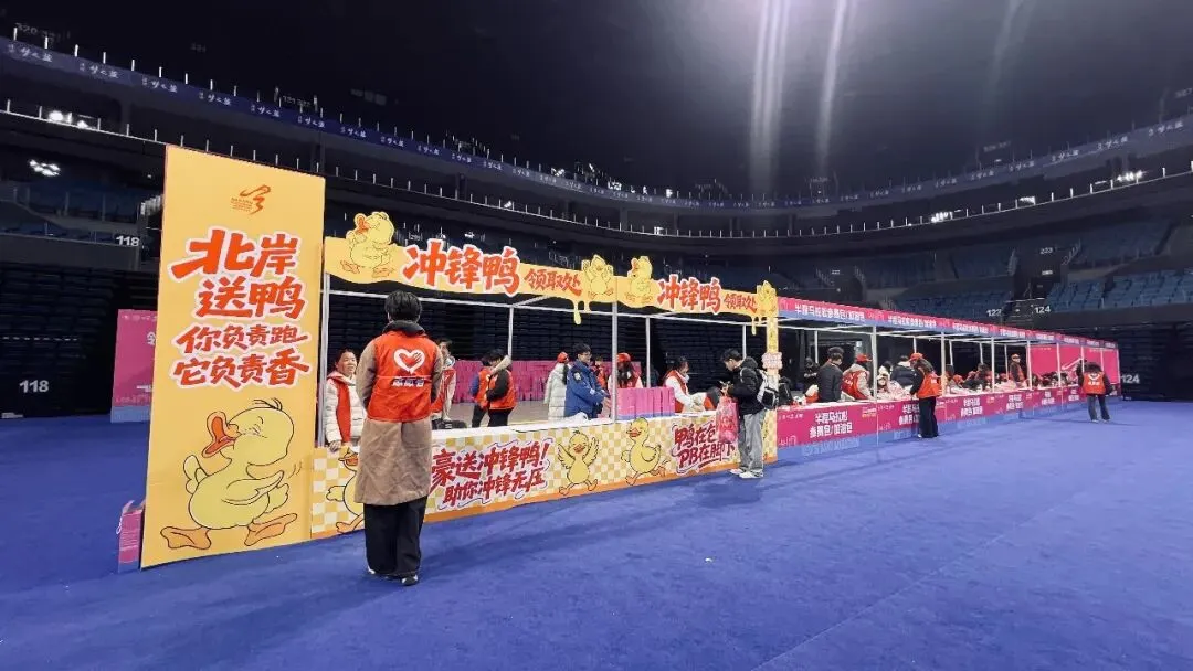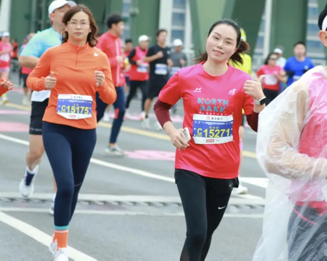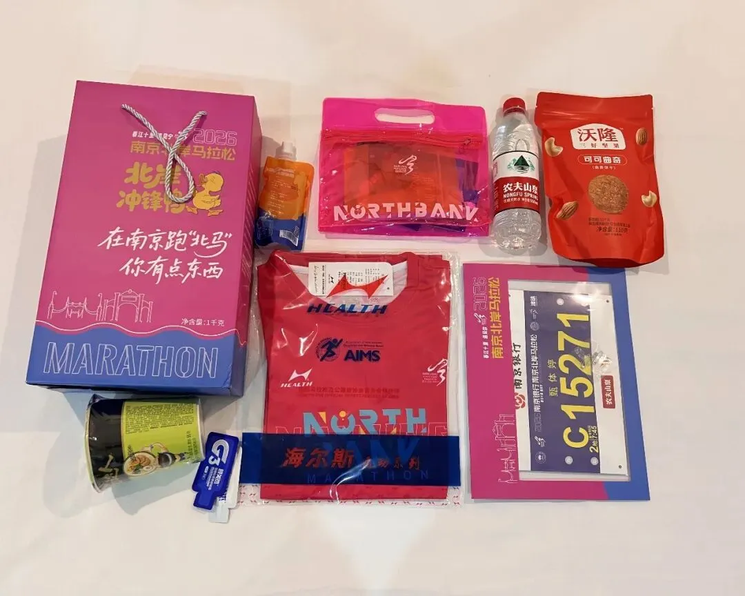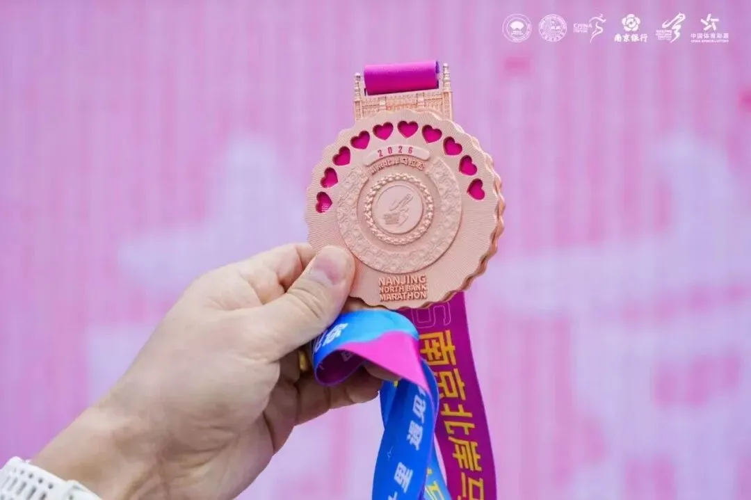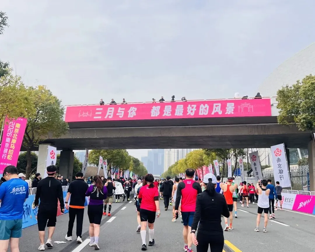 这里的第一次是属于我和小特儿的。它第一次出省,我第一次自驾去跑马拉松。300公里,3个小时的高速,以前我没有概念,坐车的时候也没觉得怎样,真正开车的时候发现很无聊,时间过得很慢,老是犯困,很难受。当然也主要是因为我本身没休息好,赛后又有点过度劳累。早上开车去起点真没有坐地铁方便,因为太难停车了,差点我就放弃了。且在封路、拥堵、混乱、时间紧张的情况下可能还有违章,好不容易一个交警同意把车停在非机动车道上,转头就被另一个交警骂。哎,太惨了!不过大家都没计较,因为各有难处。幸好保利阅云台的物业好心让我把车停在小区地下车库,才最终踏上赛道。然后又有了停车一分钟找车半小时的悲惨经历——因为天气太冷,而我只穿了件参赛服。还好,最终在晚自习之前赶回学校,全程130-140码,掉电75公里,回到学校显示电量只有5%,25公里了,有惊无险。如果再有下次,开高速如果不能休息的话,估计300公里也就是我的极限了,再长就算了吧。 领物资的时候就发现了“全马半马都是马,烤鸭盐水鸭都是鸭”的标语,盐水鸭我知道,是南京特产,冲锋鸭早早就准备在参赛包里了,烤鸭是什么意思呢?直到完赛的时候才揭晓答案,原来每一位完赛选手都可以品尝烤鸭。真是“完赛后的第一口烤鸭比奖牌还香”呀。 出发就被“三月与你,都是最好的风景”的标语吸引。粉红的出发拱门和粉红的标语相映成趣,刚过天桥又被歌曲《向快乐出发》所吸引,欢快的节奏完全又一首跑步神曲,第二次听到它是在江边,一群活力满满的马拉松宝贝随着节奏舞动,青春、欢乐、自信,在初春的新绿里闪闪发光。结束时路过该广场,刚好在播放《光辉岁月》,一路的疼痛与坚持瞬间就释怀了。起跑时遇见一小哥哥,大学生的模样,他问我多大了。很神奇,40居然在我的心里一闪而过(这是第一次)。我:我跑步已经十年了(多么欲盖弥彰的回答,哈哈)。是啊!十年过去了,年轻的时候,甘当大神的背景板。年长了,又甘当年轻人的背景板,甚至有时候只是去充当一下分母。80后慢慢不再年轻,也慢慢不再可能是赛道上跑得最快的人,但是80年代的歌曲却依然统治着赛道。 因为我一直秉持玩赛的心态,所以在赛道上没受过伤。只是去年半年内左膝盖连续磕了两次后,一只隐隐做痛,2个多月过去了,只要跑步,就会疼。所以整个冬季,我是零训练。 南京北岸马拉松本没打算报名,对南京的赛事整体感觉中规中矩,不做评论。同事报了名,因为他是首马,出于安全考虑,我觉得有必要陪跑一下,结果他没中签我中了。 虽然是零训练,除了不可抗拒的因素,一般中签赛事我不会放弃,所以3月8日准时赴约。也想检验一下膝盖的疼痛到底是心理作用还是身体对离开舒适区的抗议,还是膝盖真的有问题。 事实证明不管是赛中还是赛后,左膝盖比右膝盖的疼痛都厉害的多,说明还是有问题,准备抽空去做个检查。 在最后一公里赛段,全马选手和半马选手并排冲线,全马跑在这个位置的都是破三大神。有的如风般飞过,有的脚步重重地砸在地上,有的边跑边喊,把身体的痛喊出来——他们都在做最后的冲刺。 突然,一个白净,175左右,20出头的帅气小伙瞬间跌倒,由于惯性翻了一个跟头,又一秒钟起身,恢复奔跑。我都没回过神,就像什么都没发生一样,他已翻过坡顶消失在路的转弯处。或许是因为年轻,或许是因为健康,或许是因为毅力,他看起来没有任何问题。但愿他没有受伤,能一直跑下去。五、这是一场安徽省会(合肥)和多省省会(南京)共同打造的赛事因3月7日有事,一路狂飚才赶在21:00来到南京青奥体育公园1号门领取物资(结束时间21:30),我也是算到自己今天还能领到物资,所以一腔孤勇,一路向东。 领物流程简洁,但该有的都有。场馆布置也简单,但大气。志愿者依然在坚守岗位。我陶醉在粉和蓝打造的浪漫、唯美、静谧的氛围里。没想到这两种颜色能搭出这么美的效果。 这是大江大河里的小细腻。粉我知道,跟无锡的很像,甚至有点错觉,肯定是樱花粉。蓝是什么呢?转身看见“洋河经典——梦之蓝”飘在空中,那就是梦之蓝吧。 我很好奇,从格调和物资搭配都让我联想到汇跑赛事。毕竟近两年南马也是汇跑赛事运营的,而且口碑飙升,现在也一签难求。但又不完全是汇跑的风格(参加了4届锡马都是汇跑运营的,很熟悉)。我忍不住查了一下,原来是安徽波动体育。这个在安徽省合肥市包河区孵化的体育文化科技有限公司,成立于2007年,已连续多次中标合肥马拉松,滁州马拉松,阜阳马拉松等多场省内外赛事的运营。 希望假以时日,人们提起马拉松赛事运营公司,想到汇跑的同时也能想到波动。“赛事奖牌以 ‘时光流转’为核心设计理念。采用可转动夹层圆盘工艺,轻轻转动间,2016至2025十载年份依次呈现,每一格,都是一段奔跑的记忆;每一圈,都是一次与自己的重逢。”