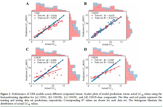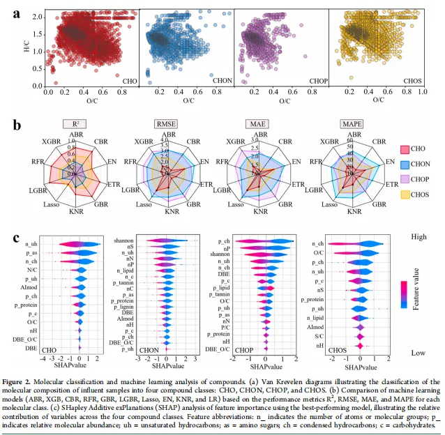 - CHO 类化合物是废水毒性的核心预测因子:机器学习模型中,CHO 类化合物模型预测性能最优,CatBoost 回归模型的 R² 达 0.84,远高于 CHON(R²=0.68)、CHOP(R²=0.59)和 CHOS 类(R²=0.59);SHAP 分析表明,不饱和烃类、稠环烃类和氨基糖类化合物是 CHO 类中贡献最大的三类毒性相关分子特征,代表性多环芳烃的靶向验证进一步证实了模型预测的可信度。