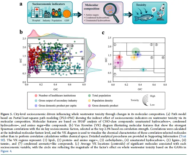 新兴证据表明,社会经济因素可显著影响城市废水中污染物的组成和浓度。例如,人口规模更大或工业活动更密集的城市,可能向废水中排放更多种类和更高负荷的污染物。这些人为差异不可避免地改变 DOM 的分子特征,进而调节废水整体毒性。尽管这种社会经济与废水的关联在概念上直观易懂,但核心未解决的问题是:特定社会经济驱动因素是否以及如何通过可识别的分子介质影响废水整体毒性。填补这一知识缺口,需要从基于相关性的分析转向明确的机制框架,即通过分子水平路径将社会经济条件与毒性联系起来。然而,社会经济因素在分子水平上影响废水整体毒性的具体路径仍不明确,尤其是在缺乏系统性调查的全国尺度上。这种认知不足限制了旨在降低污染风险、促进可持续城市水资源管理的有效、源头导向型废水管理策略的制定。