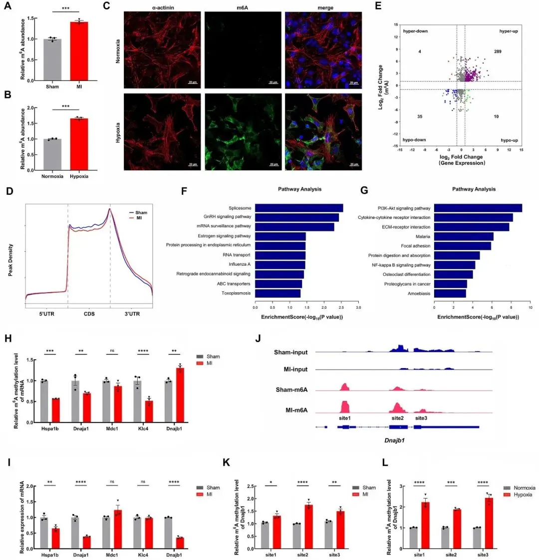 本研究首先通过全转录组测序分析发现,在MI后4周的小鼠左心室组织及缺氧处理的原代小鼠心肌细胞中,整体m6A修饰水平均显著升高。经系统性筛选最终鉴定出DNAJB1为在缺血缺氧心肌损伤中,m6A修饰水平升高且mRNA丰度下降的关键基因。