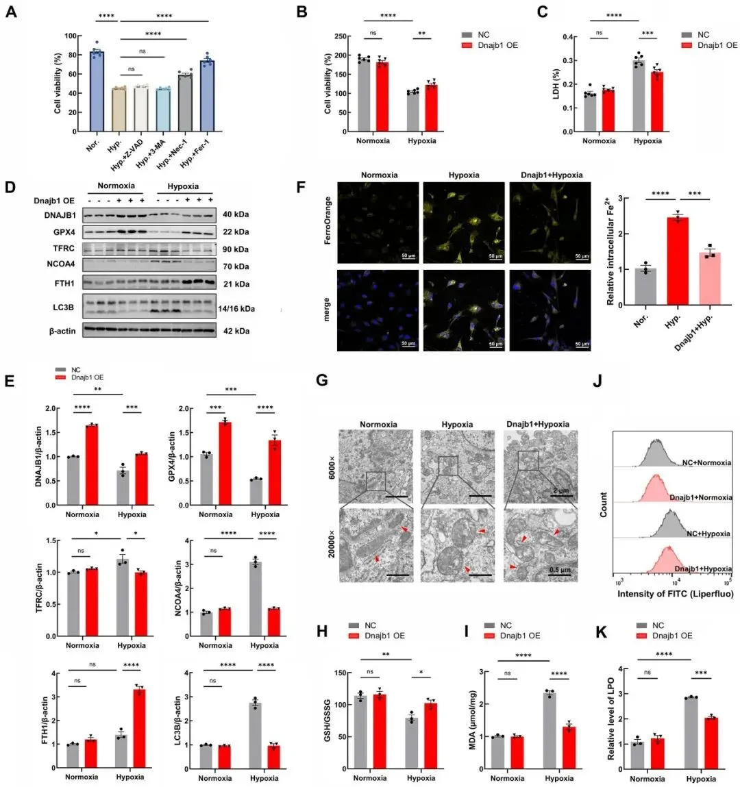 在缺氧心肌细胞中,铁死亡抑制剂Fer-1的保护效果优于凋亡或自噬抑制剂,提示铁死亡是此过程中的主要细胞死亡方式。过表达DNAJB1则能有效抑制缺氧诱导的促铁死亡效应蛋白表达,并减轻细胞内铁过载、谷胱甘肽(GSH)耗竭及脂质过氧化物(LPO)水平,同时维持线粒体超微结构完整性,表明其对心肌细胞铁死亡具有保护作用。
