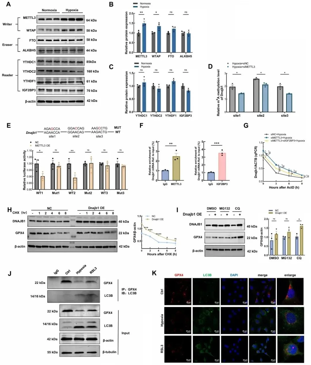 机制研究显示,甲基转移酶METTL3能够直接结合Dnajb1,上调其m6A修饰水平并降低mRNA稳定性。正常情况下,m6A阅读蛋白IGF2BP3通过识别m6A位点稳定Dnajb1 mRNA,但在缺氧环境下,表达上调的METTL3与IGF2BP3产生竞争,加速Dnajb1 mRNA的降解。进一步研究发现,DNAJB1发挥抗铁死亡作用是通过抑制自噬-溶酶体途径来阻止抗氧化蛋白GPX4的降解,从而逆转缺氧引起的GSH消耗和LPO产生。