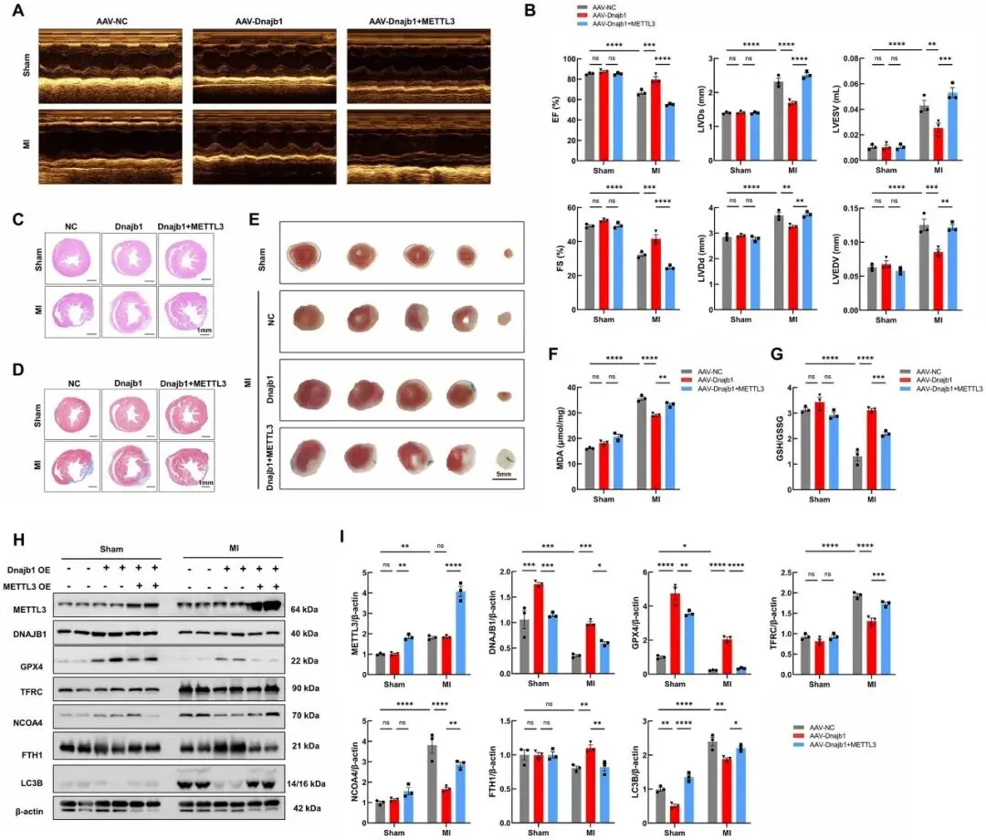 最后,研究团队利用心肌特异性cTnT启动子驱动的腺相关病毒(AAV9),在MI小鼠体内过表达DNAJB1,能显著改善小鼠心脏功能,同时缩小梗死面积并减轻心肌纤维化程度;而同时过表达METTL3时,DNAJB1的心脏保护作用和抗铁死亡效应被明显抵消,证实了METTL3对DNAJB1的负向调控作用。
