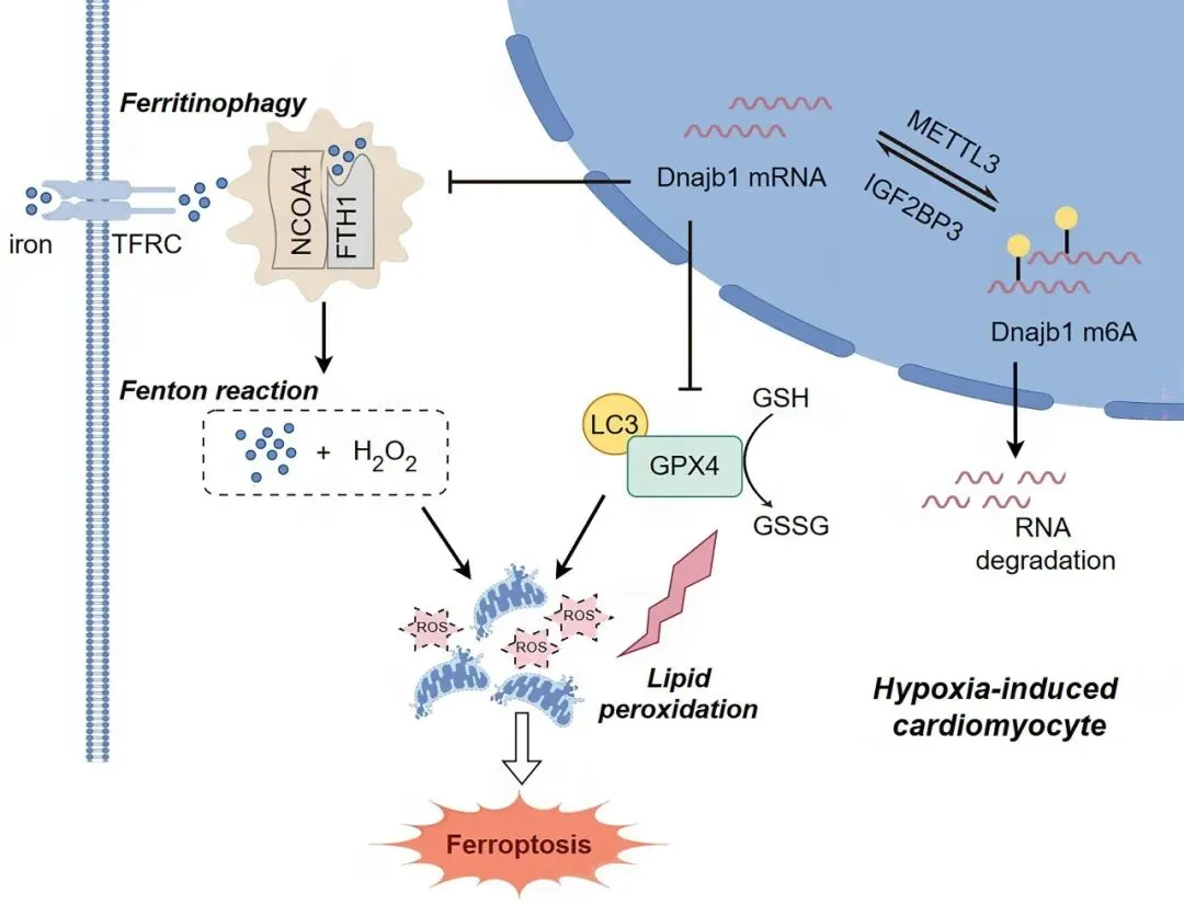 综上所述,本研究阐明了METTL3/Dnajb1/GPX4轴在缺血性心肌损伤中的调控作用,MI诱导的METTL3上调通过m6A修饰降低了Dnajb1 mRNA的稳定性,导致核心蛋白GPX4的溶酶体降解,从而驱动心肌细胞铁死亡。该发现揭示了m6A表观遗传修饰在缺血性心肌损伤中的关键调控作用,从而为将来MI的靶向治疗指明了方向。