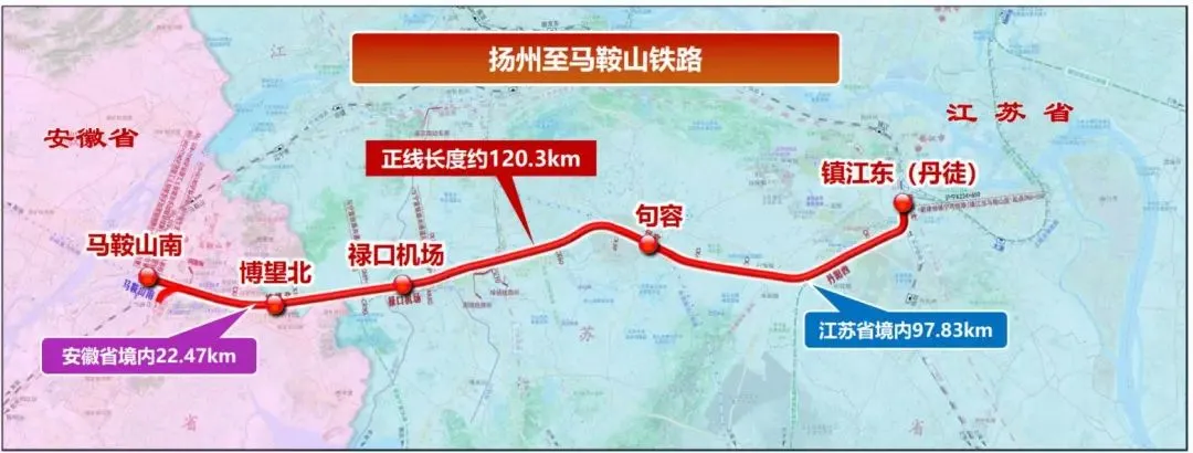 扬州经镇江南京至马鞍山铁路镇江至马鞍山段位于江苏省和安徽省境内,线路起自丹徒站,向西经丹徒区、丹阳市、句容市,江宁区、溧水区,博望区、雨山区,终至巢马铁路马鞍山南站。