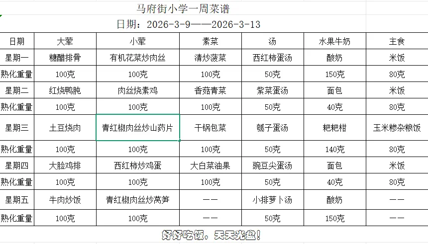南京市马府街小学2025-2026学年第二学期第2周菜谱