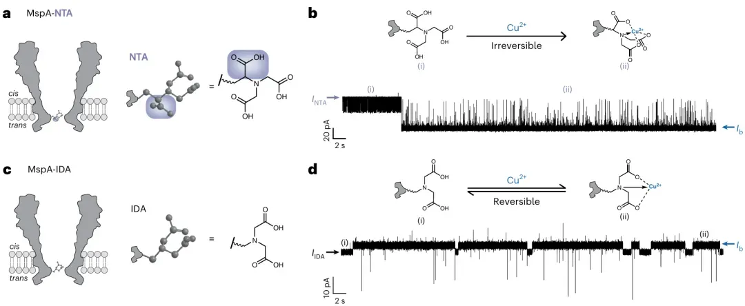 图1展示了用于二价金属离子分析的纳米孔工程策略。该图比较了两种配体修饰的MspA纳米孔:MspA-NTA(接枝氮川三乙酸)和MspA-IDA(接枝亚氨基二乙酸)。其中,NTA适配体比IDA多一个羧甲基基团(紫色区域)。作者以Cu²⁺为模型分析物,在+80 mV跨膜电位下进行传感。结果显示,MspA-NTA与Cu²⁺的结合导致了电流的突然且不可逆的下降。相反,MspA-IDA则表现出开孔电流(IIDA)与Cu²⁺诱导的阻塞电流(Ib)之间可重复的转换。这表明,相较于导致不可逆结合的NTA,简化后的三齿IDA配体更适合实现金属离子的可逆结合和动态传感,为开发通用的多金属离子传感器奠定了基础。