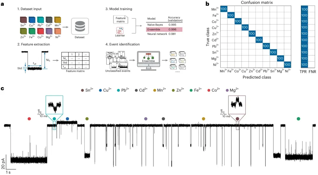 图3 展示了基于机器学习的M²⁺离子识别。该图概述了机器学习分类的工作流程:首先从每种M²⁺的传感事件中提取%Ib、Std和toff三个特征构建特征矩阵;然后使用MATLAB分类学习器训练多种算法(包括朴素贝叶斯、集成和神经网络)。通过十倍交叉验证评估,集成模型获得了最高的验证准确度(0.996)和完美的测试准确度(1.000)。混淆矩阵显示所有离子类别的识别准确率均为100%。作者进一步展示了利用训练好的集成模型,对九种M²⁺混合溶液(Ni²⁺因事件时长过长被排除)同时传感所产生的事件进行自动预测和标记的结果,证明了该策略在实际混合样品自动分析中的可行性。