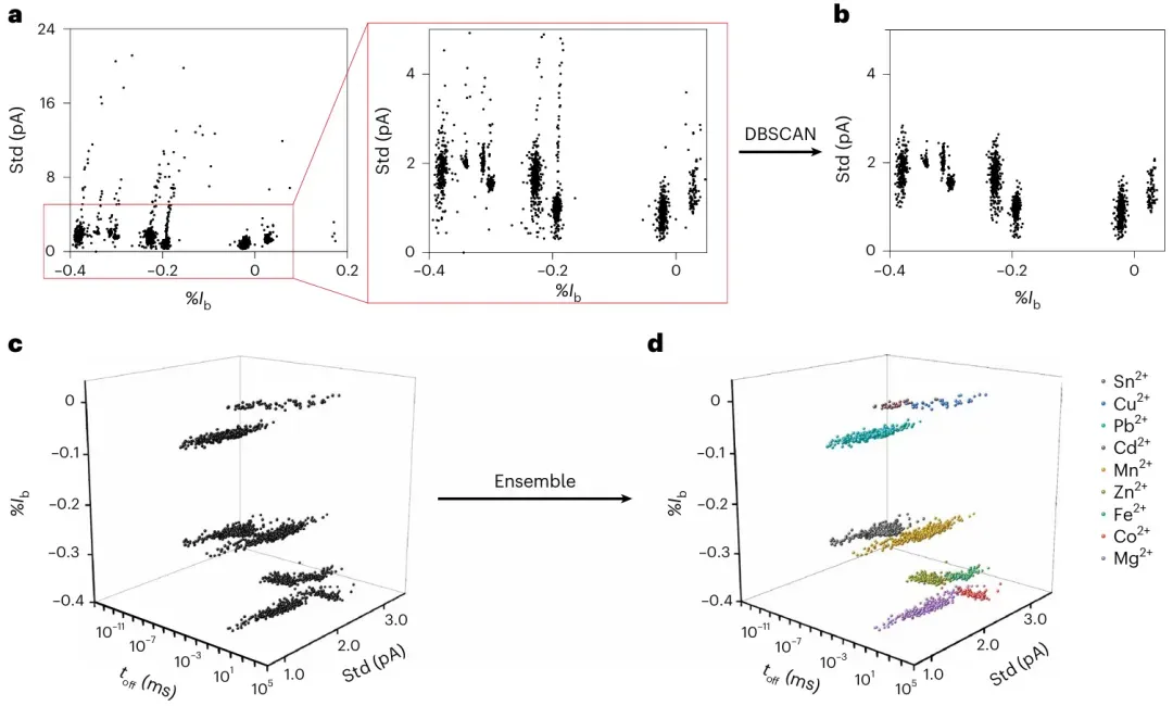 图4展示了机器学习辅助的事件识别过程。该图对比了在同时传感九种M²⁺的原始数据中,经过DBSCAN聚类分析去除噪声事件前后的二维(% Ib vs. Std)散点图。处理后的数据点聚类更加清晰。随后,基于处理后的数据构建了包含%Ib、Std和toff三个维度的三维散点图。最后,使用已训练的集成模型对事件进行自动分类预测,并将预测标签着色显示在三维散点图中。结果显示,机器学习自动预测的离子类别分布与前期分别单独采集各离子时观察到的分布模式高度一致,验证了分类模型的可靠性和自动化分析流程的有效性。