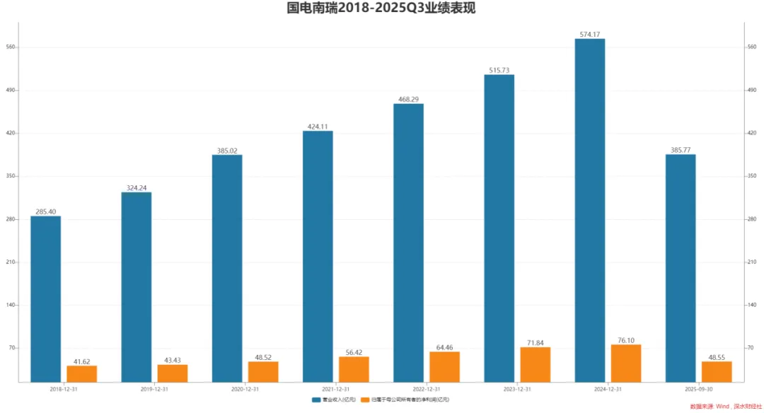 国电南瑞2025年三季报显示,公司前三季度实现营业收入385.77亿元,同比增长18.45%;归属净利润48.55亿元,同比增长8.43%。