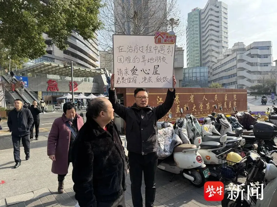 “在治疗过程中,遇到困难的异地朋友,请来爱心屋。免费住宿、洗衣、做饭。”3月7日上午8点40分左右,46岁的柴伟站在江苏省人民医院的门口,高高举起告示牌,为善佑爱心屋打着广告。