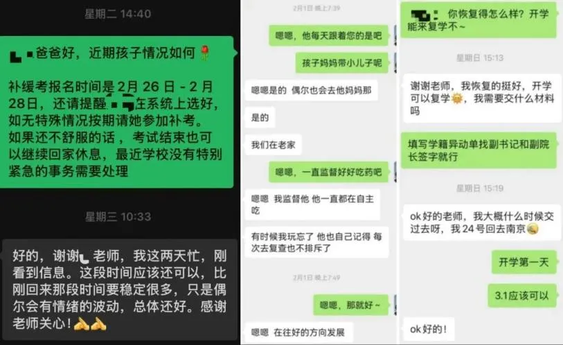 心理学院充分发挥专业优势,安排专业教师现场开展心理评估与疏导,赠送调适手册,帮助学生缓解心理压力、调整心态,以积极乐观的状态面对生活与学习;生命科学学院创新“1+1”同乡帮扶机制,为患病学生量身制定学习预案;法学院建立后续跟踪机制,持续发送安全提醒、学习指导与节日祝福,常态化关注学生成长动态;体育科学学院打造“物质帮扶+学业指导+心理疏导”全方位帮扶体系多维度为学生排忧解难,助力学生身心健康成长;美术学院、物理科学与技术学院针对假期突发家庭变故学生,第一时间送去关怀,帮助学生逐步走出困境,实现从迷茫彷徨到坚定前行的蜕变;金陵女子学院则将家访对象分为低年级“励志生”和高年级“发展生”,前者重在精神激励,后者聚焦生涯规划与心理疏导,让不同阶段的学生都能获得适切的成长支持。